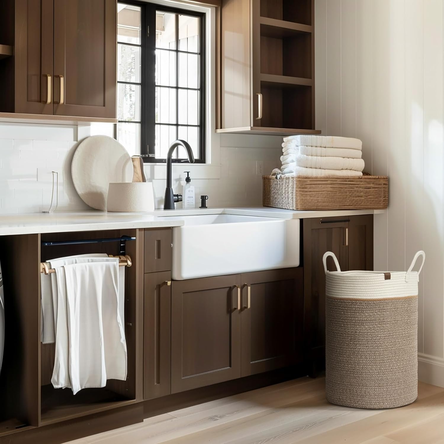 - COTTON ROPE LAUNDRY BASKET - Crafted with meticulous attention to detail, this laundry basket features premium GRS (Global Recycled Standard) certified braided cotton rope for enhanced durability and structural integrity. With its palette of white and mocha, this cotton laundry basket adds a warm, inviting vibe, perfect for any season.