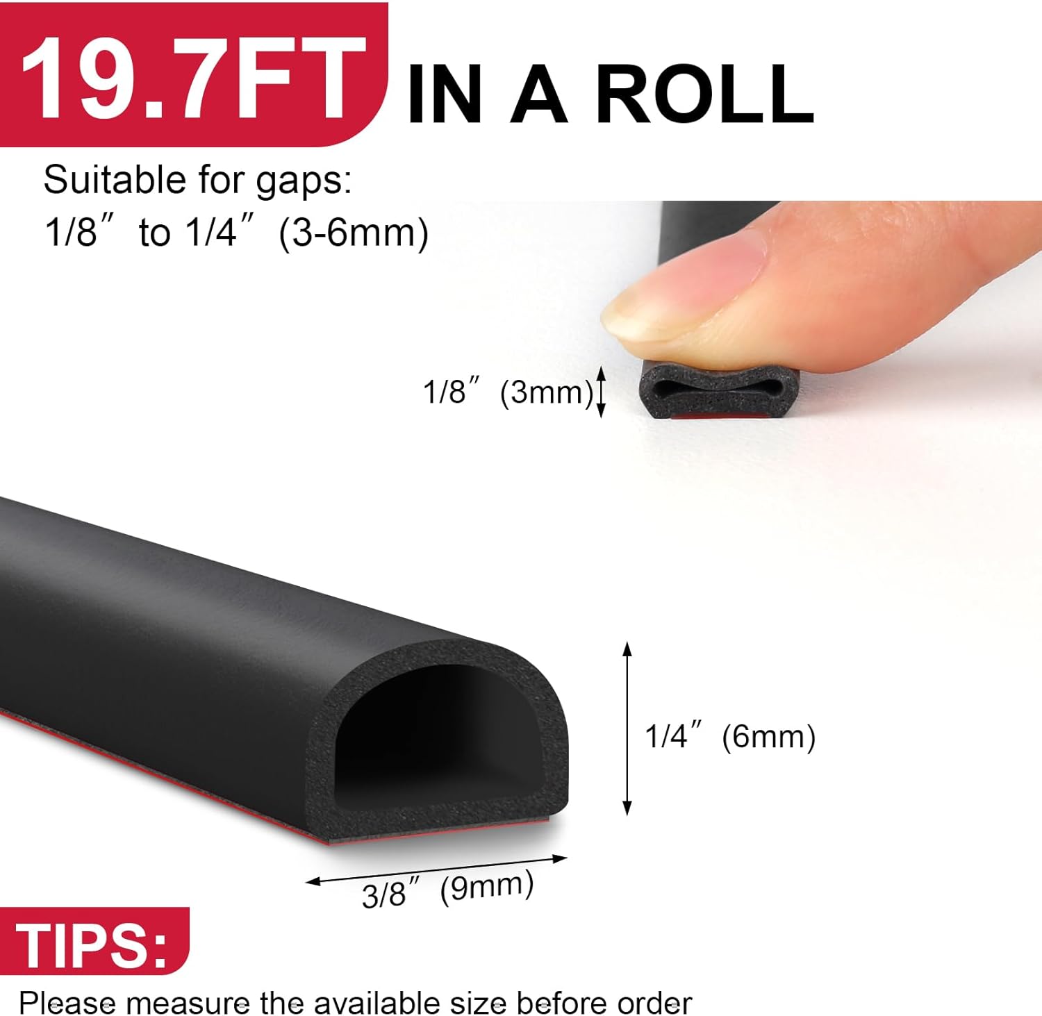 - Package Includes: The door weather stripping is 19.7 feet (6 meters) long, with a width of 3/8 inch (9mm) and a thickness of 1/4 inch (6mm). It is designed to fit gaps from 1/8 to 1/4 inch (3 to 6mm). Please measure the gap width before purchasing
