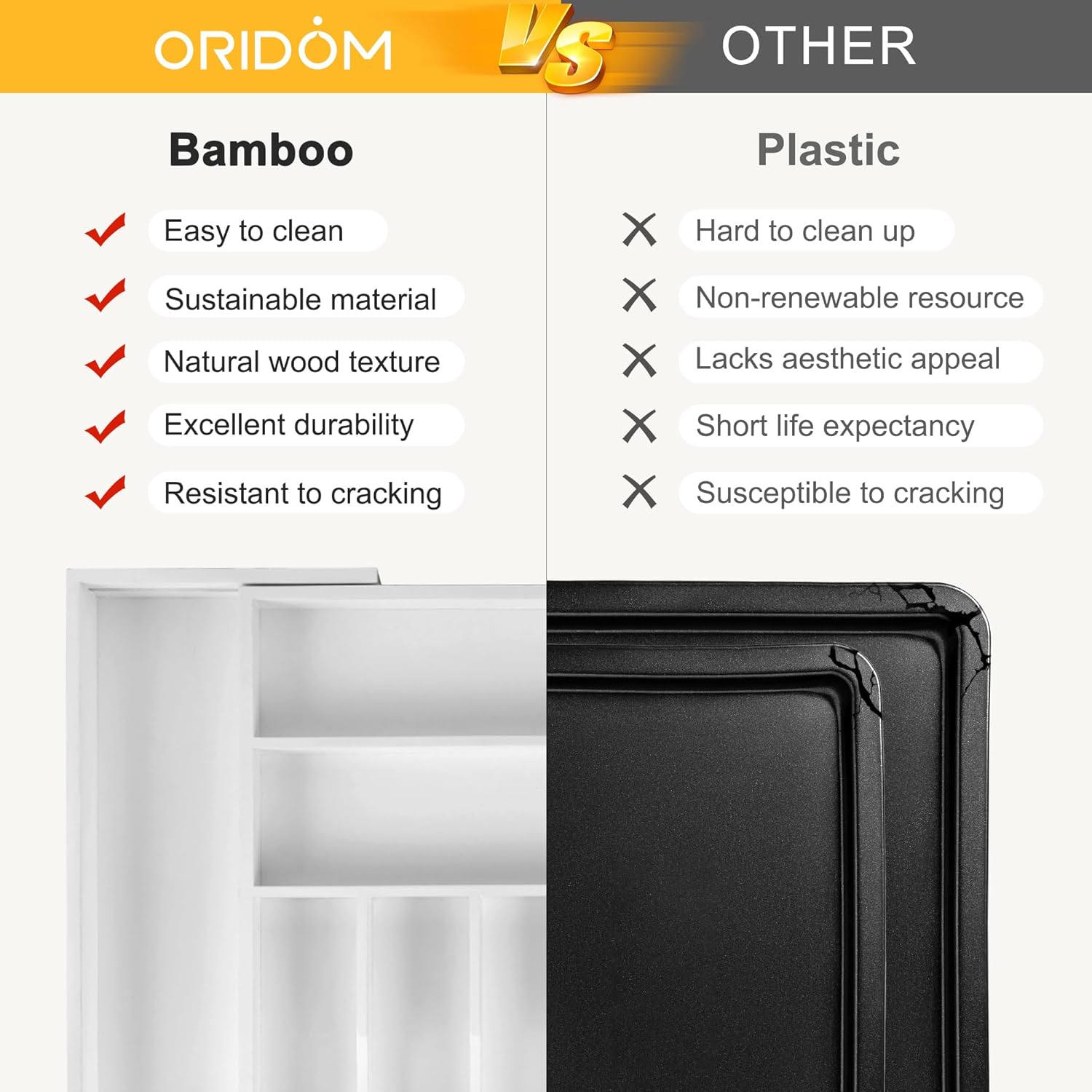 - â ăMoney -Back Warranty with OridomăAt Oridom, your happiness and satisfaction are at the heart of what we do. We're dedicated to delivering not just premium products, but also top-tier customer service: a full 1-year warranty, a no-questions-asked money-back guarantee, and round-the-clock customer assistance. We're here for you every step of the way, what you can get are high quality bamboo utensil organizer for kitchen drawers and friendly customer service.