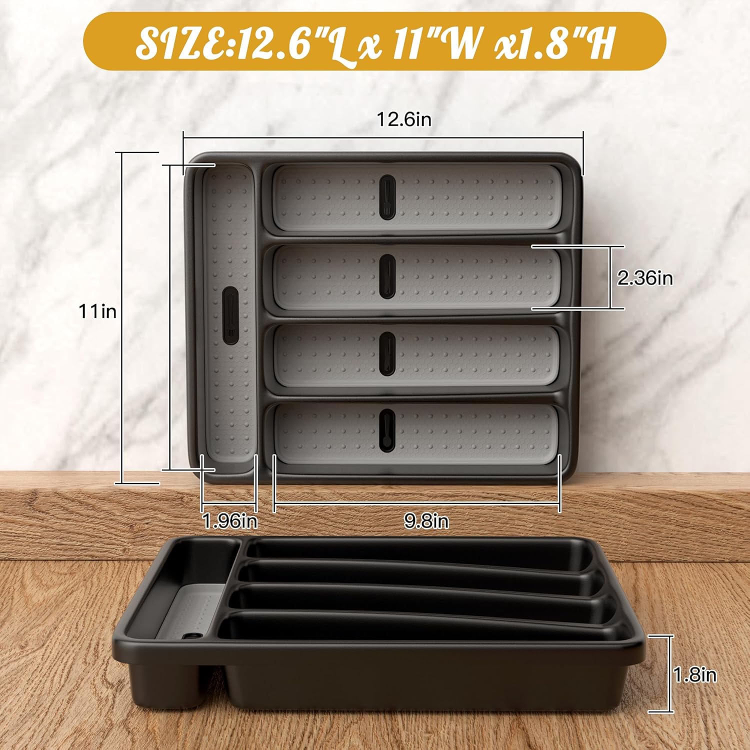 - Durable & Scratch-Proof Design for Everyday Safety Crafted from BPA-free plastic with soft TPU-lined slots, this cutlery tray protects your silverware and utensils from scratches. The non-slip rubber feet keep it firmly in place, even when drawers are opened quickly—no sliding or tipping. Safe for delicate items like jewelry or makeup brushes, it’s built to last through daily use in busy kitchens, damp bathrooms, or kids’ rooms.