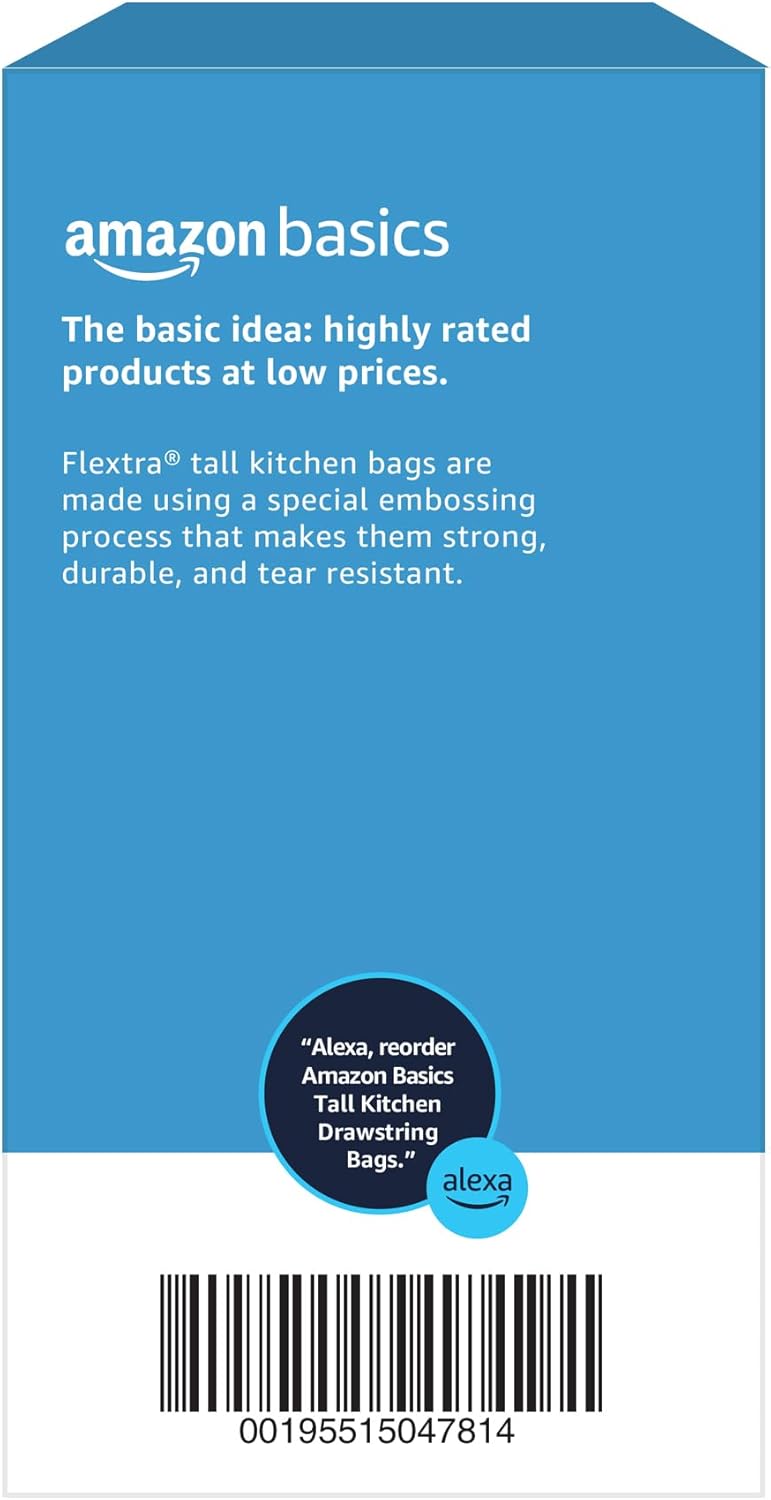 Amazon Basics 13 Gallon Flextra Strength Tall Kitchen Drawstring Trash Bags, Tear Resistant, 10% Post Consumer Recycled, 90 Count