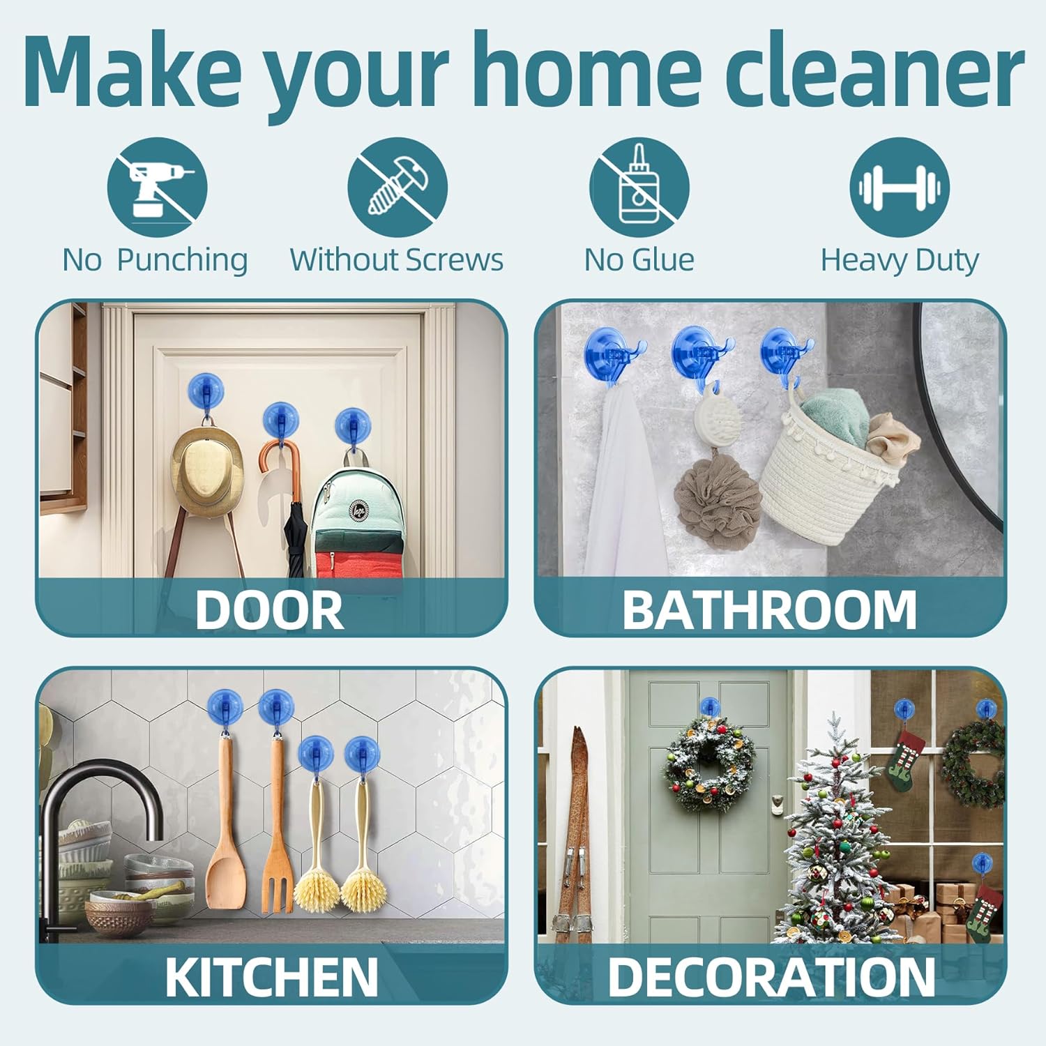 - 【Clear Hard Plastic】The Clear Suction Cup Hooks is made of premium plastic, no rust, no deformation, can perfectly organize your shower wall. Unlike Other brand in the market our suction cup hook is anti-hot-water max 158°F so your don't worry about falling off when shower hot water. Your can use it to hanging loofa, bath sponge, towel, robe, brush, clothes and more. Also suitable for outdoor glass windows Christmas wreath hanger