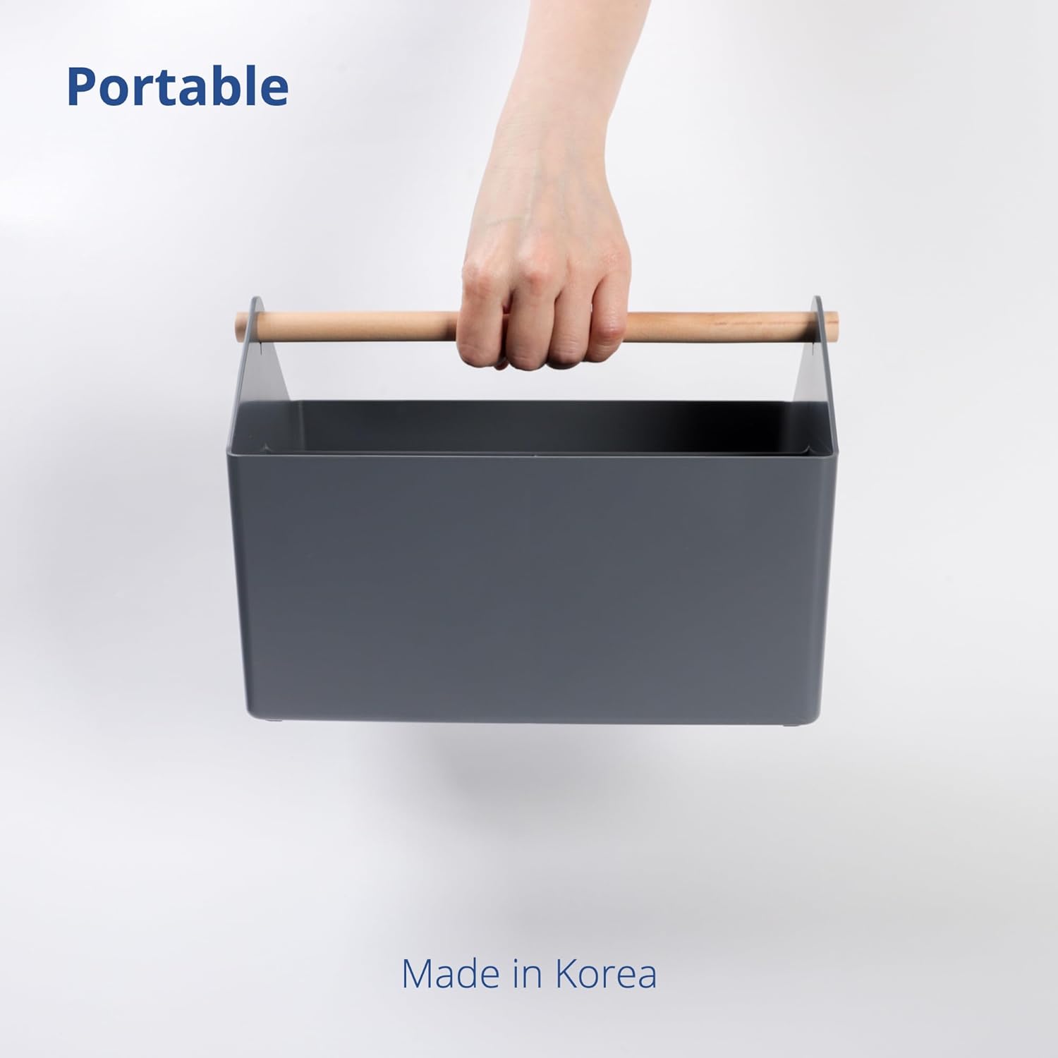 BLUE GINKGO Medium Storage Basket – Plastic Caddy with Wooden Handle for Office, Arts & Crafts, or Home Supplies (Gray)