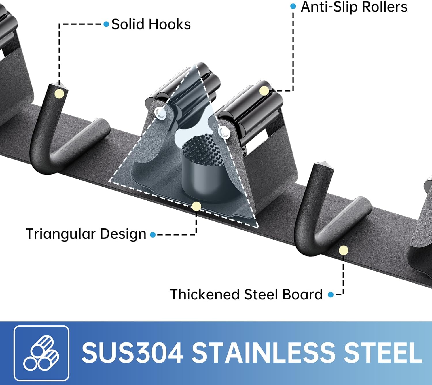 - 🏡【NON-SLIDE DESIGN】Each rack of the broom and mop holder wall mounted features an adjustable triangular design. The spring-loaded, double rubber gripped slots can keep a stronger hold on your items with diameter of 0.7 inch-1.3 inch. Whether wet mops or baseball bats, nothing slips.