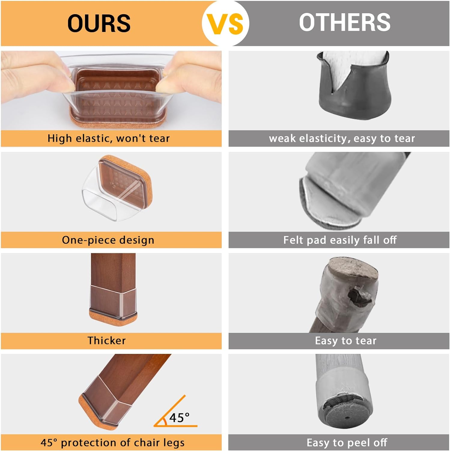 - 【Upgrade New Design】: 360° full felt pad bottom wrapped, which helps the felt bottom be able to touch the floor at any angle, preventing scratching the floor. Our chair leg floor protectors do not use gel. The bottom felt pad and the silicone chair leg floor protectors are integrated with a high-pressure machine to ensure that they will never fall off.