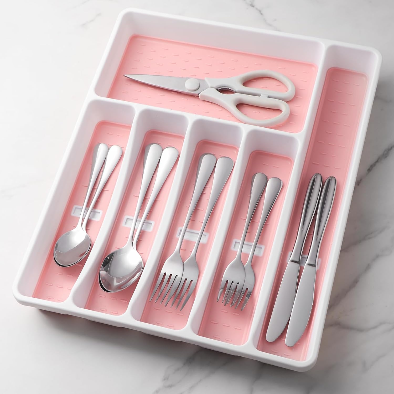 Silverware Organizer with Cutlery Icons,Pink Kitchen Silverware Tray for Drawer,Plastic Flatware Tableware Cultery Drawer Organizer Utensil Organizer with Non-slip TPR Linings,6-Compartment,Pink