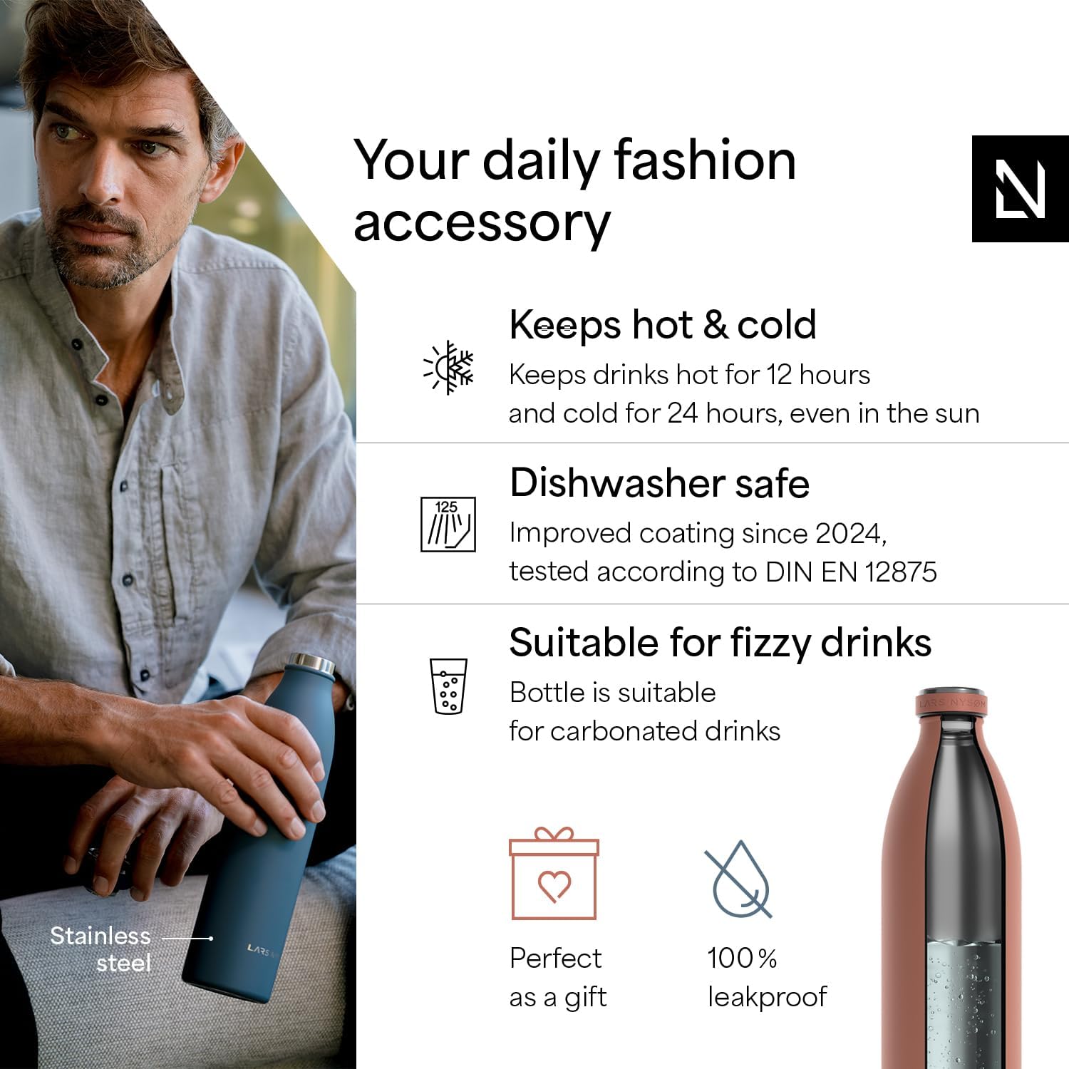 - IDEAL GIFT: The water bottle is perfect as a gift for Christmas. The sports bottle is made of high-quality 18/8 Stainless-Steel and is ideal for carbonated drinks, water and juices.