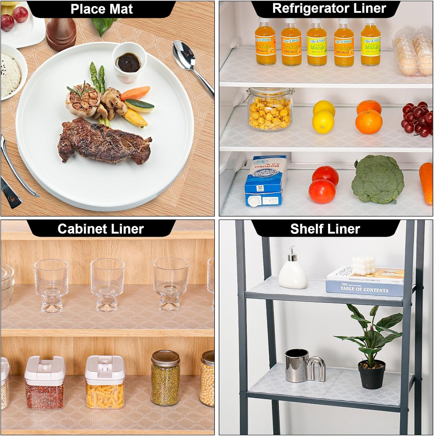 - PREMIUM SHELF LINER: The cabinet liners for shelves is made of a safe food-grade EVA material. The shelf liners can directly contact fruits and vegetables, as well as protect shelves, drawers, cabinets and refrigerators from scratching.It also has an anti-slip effect to protect the contents inside from collision and damage.