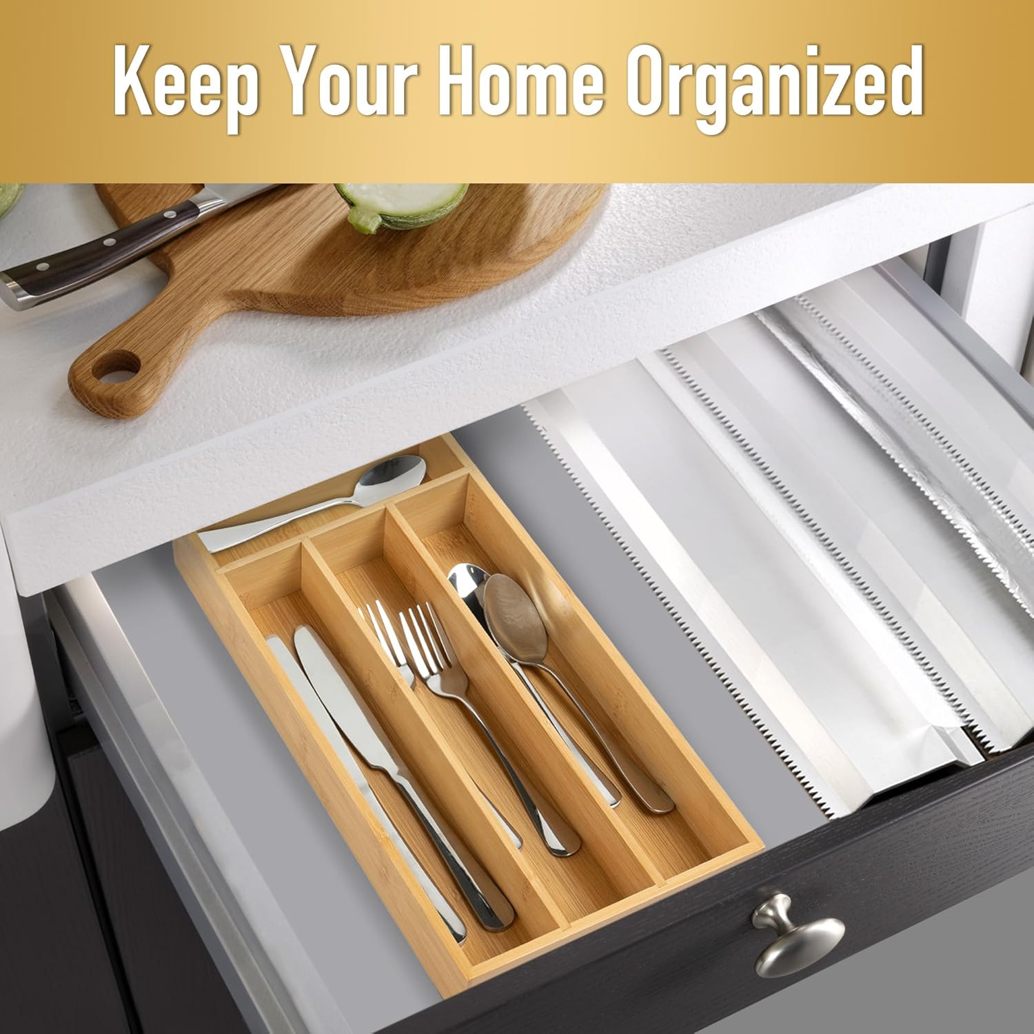 - 【Sturdy and Well-made】Our silverware tray for drawers is crafted from aged bamboo, making it highly durable for long-term use. The eco-friendly material ensures that your flatware and utensils remain resistant to water and odors. Additionally, the silverware tray's design even prevents knives from leaving scratches. Unlike plastic and metal, our bamboo kitchen drawer organizer boasts a classic and natural aesthetic. Its color and texture are 100% natural and consistent throughout, adding elegance to your kitchen.