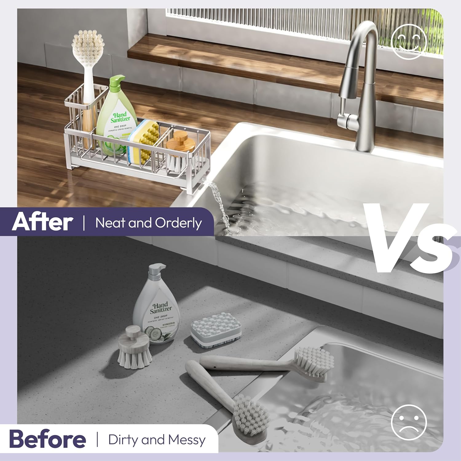 - [Large Storage Space Kitchen Essentials]: Our kitchen sink caddy organizer will give you a neat and clean kitchen for its strong storage capacity. Soap holder can hold three brushes, one rubber plug and a sponge, one bottle of soap dispenser-no swinging and no falling