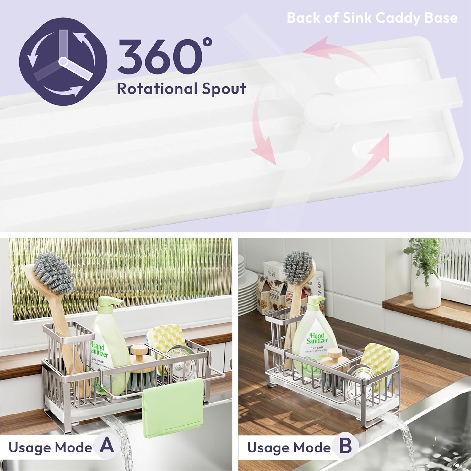 - [Automatic Draining]: Are you tired of cleaning the countertop?SWTYMIKI sponge holder for kitchen sink with 360ยฐ rotatable draining pipe can help you! Just put the sink caddy next to the sink, the water will drain automatically into the sink
