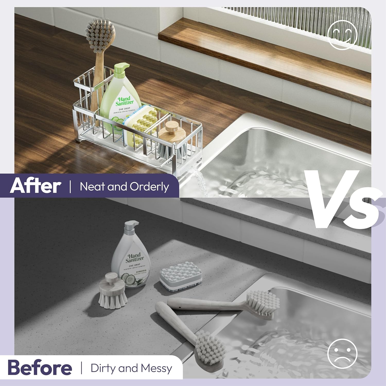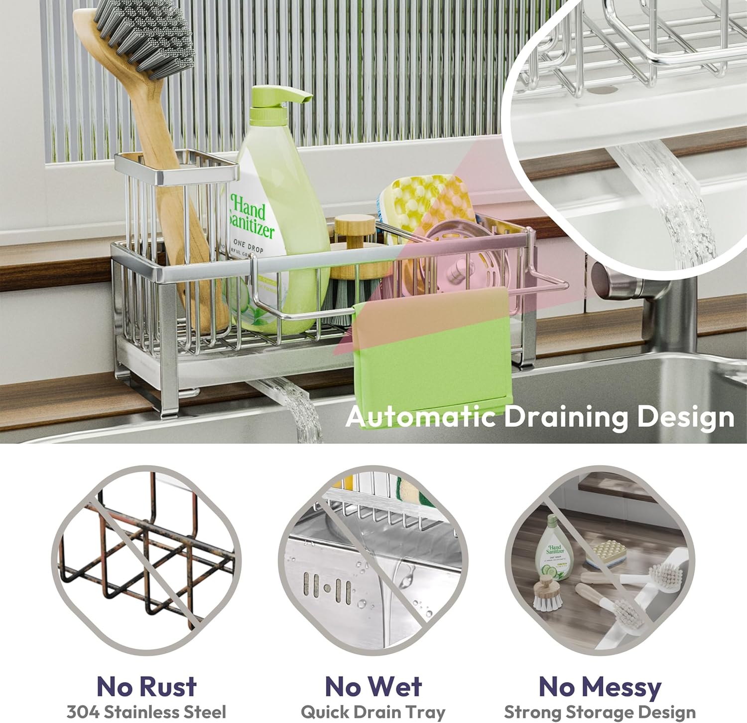 - [High Quality Stainless Steel Material]: Our kitchen sink organizer is made of 304 stainless steel, which is rustproof, waterproof and durable. The sink organizer sponge holder is very solid, and it can be rinsed directly, Don't worry about rust