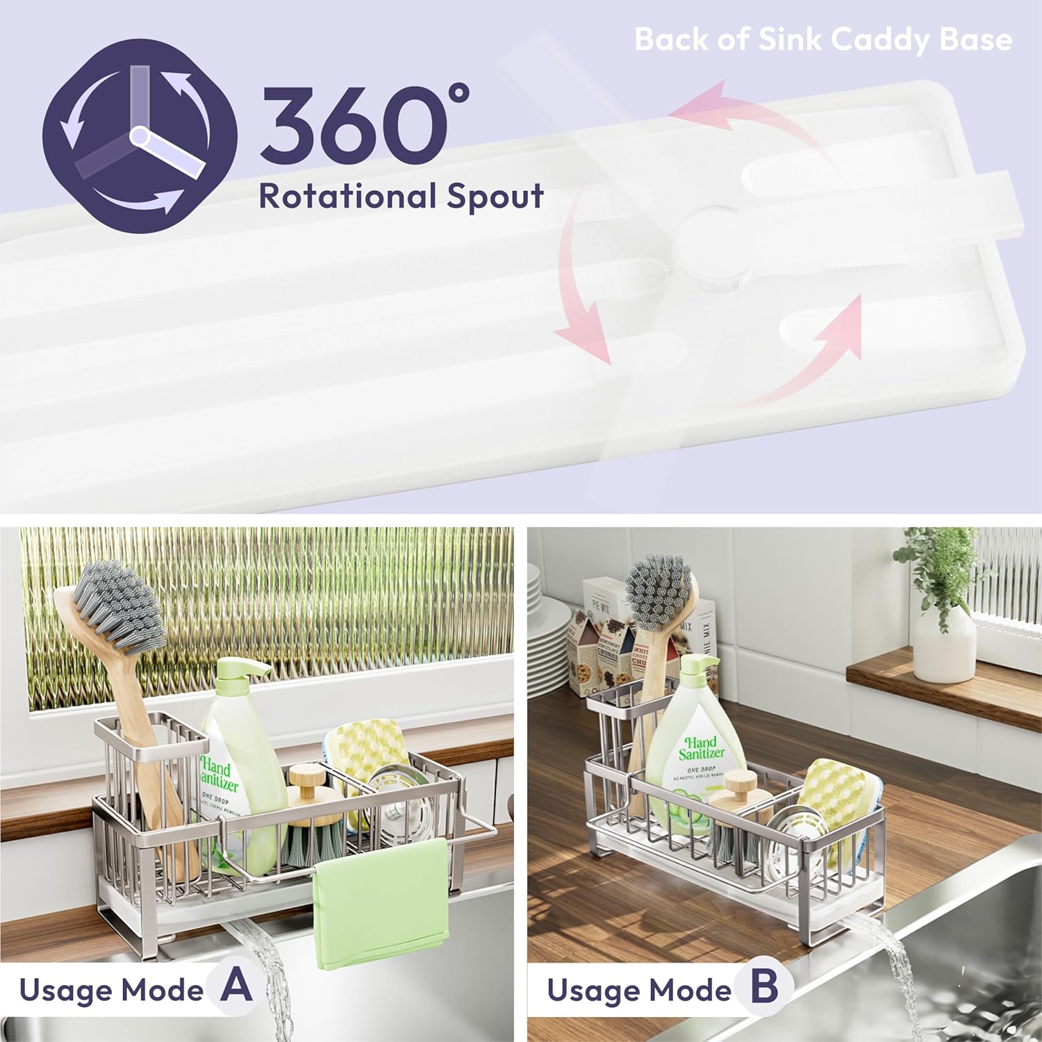 - [Automatic Draining]: Are you tired of cleaning the countertop?SWTYMIKI sponge holder for kitchen sink with 360ยฐ rotatable draining pipe can help you! Just put the sink caddy next to the sink, the water will drain automatically into the sink