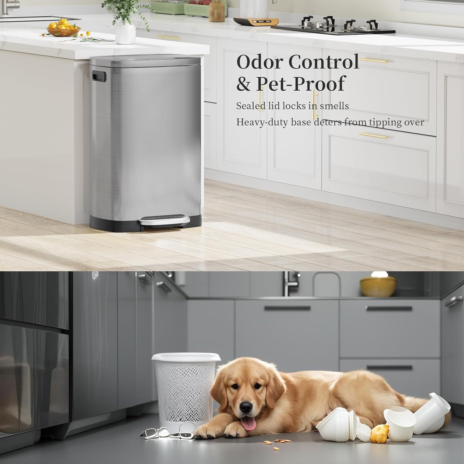 - 【High Quality Construction】13 Gallon Garbage can made of sturdy stainless steel with brushed surface, anti-fingerprints and easy to clean. ABS handle and base, anti-slip design.Pedal tested 200,000 times, service life over 25 years.
