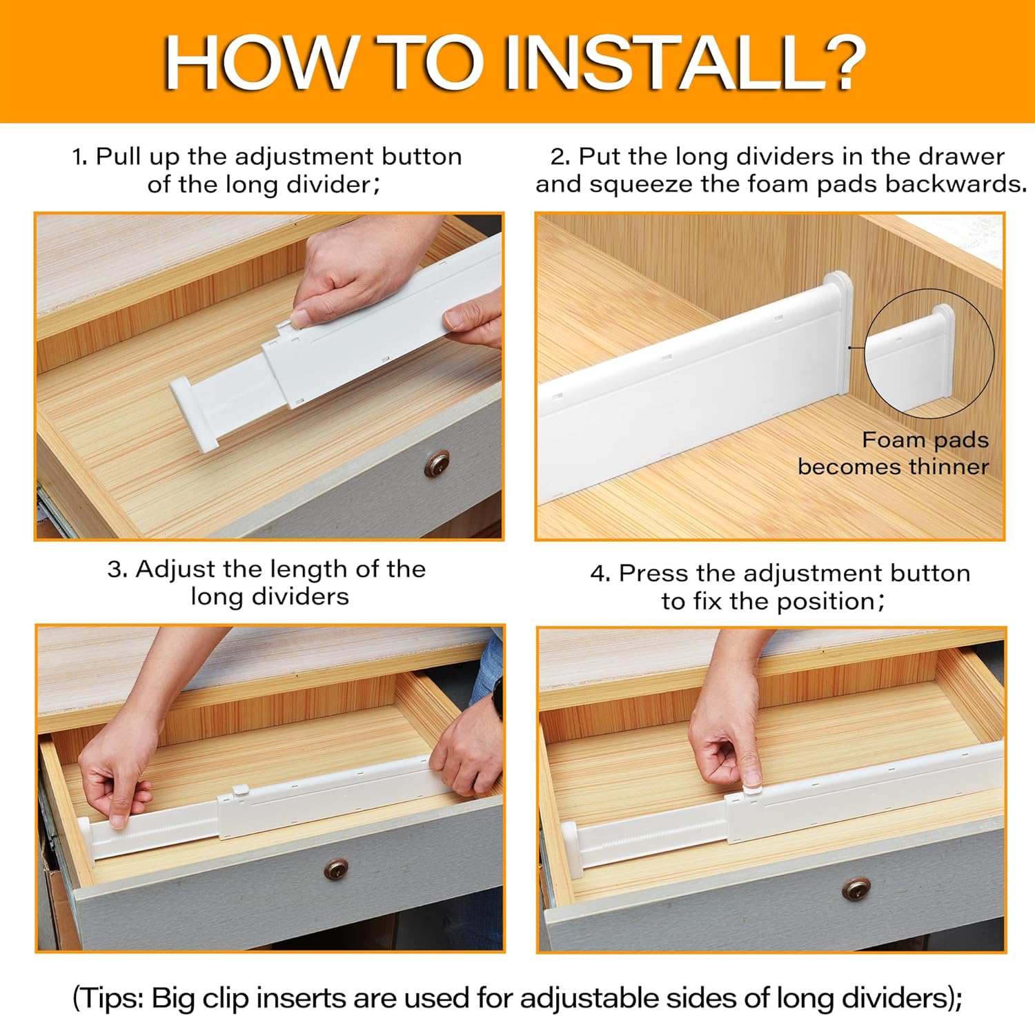 - Long Lasting & Stable Grip: To ensure the most lasting stability of the dividers, we adopt the serrated design to fix instead of the spring structure on the market. So there is a pull tab on the long divier which need to be pushed from the bottom to the top with our thumb. There are also foam pieces covered on kitchen drawer dividers that are a nice touch for grip. Protect the drawer from scratches, leaving no traces or residues