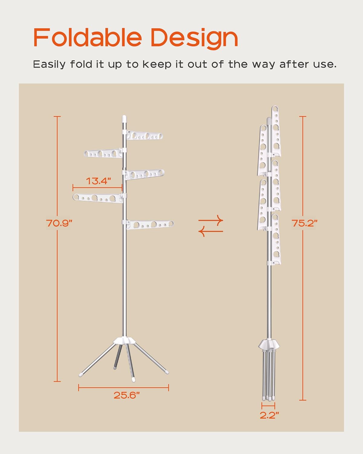 - [Foldable and Space-Saving] This vertical drying rack measures 25.6βD x 25.6βW x 70.9βH and takes up very little space. After use, simply fold the four legs and three drying rods into a smaller size: 2.2 "D x 2.2 "W x 75.2"H, which can be leaned against the footrest, perfect for apartment laundry rooms or narrow spaces and corners.