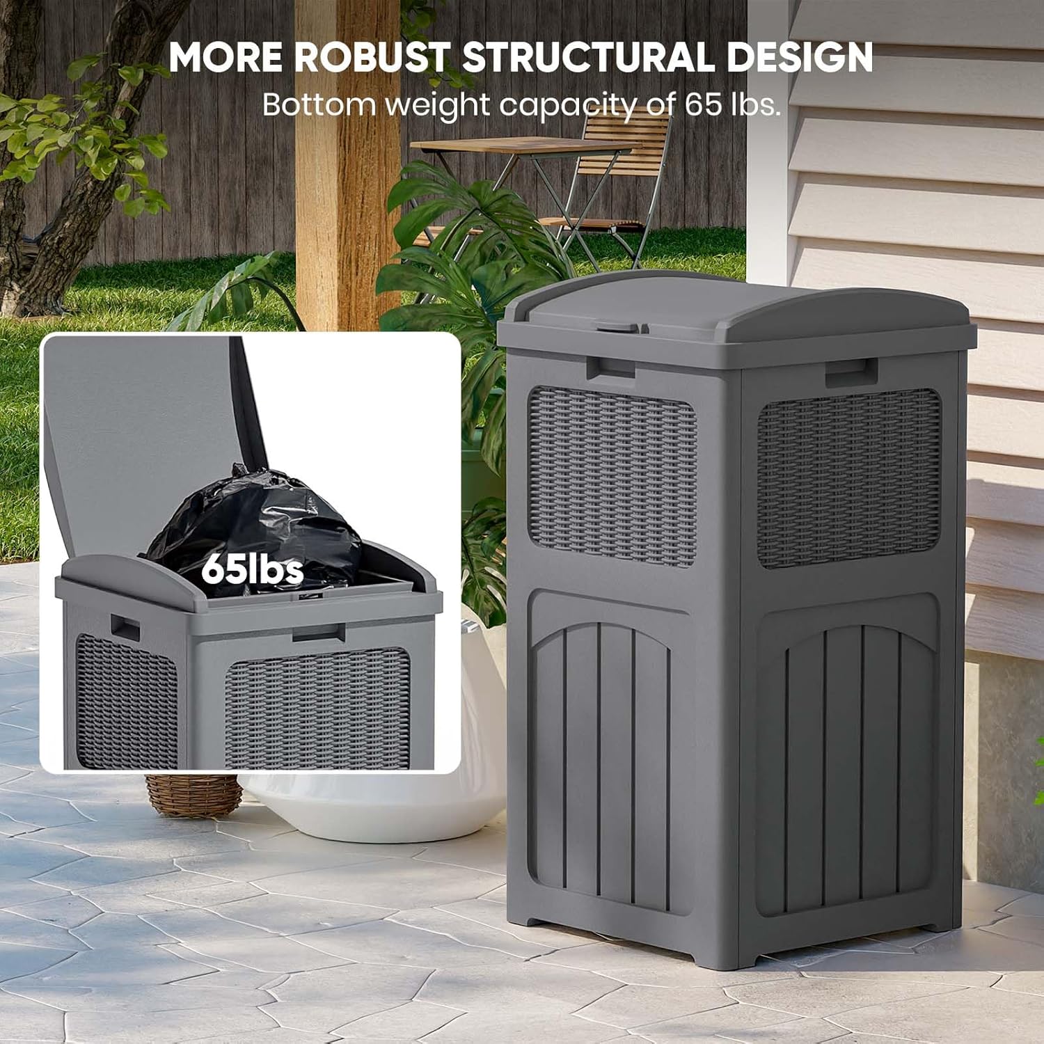 - Stylish appearance: With wicker design on the outside, it can be placed on any deck or patio, and can also be matched with other furniture.The wide range of colour variants gives you more options for integrating the bin into your home style.