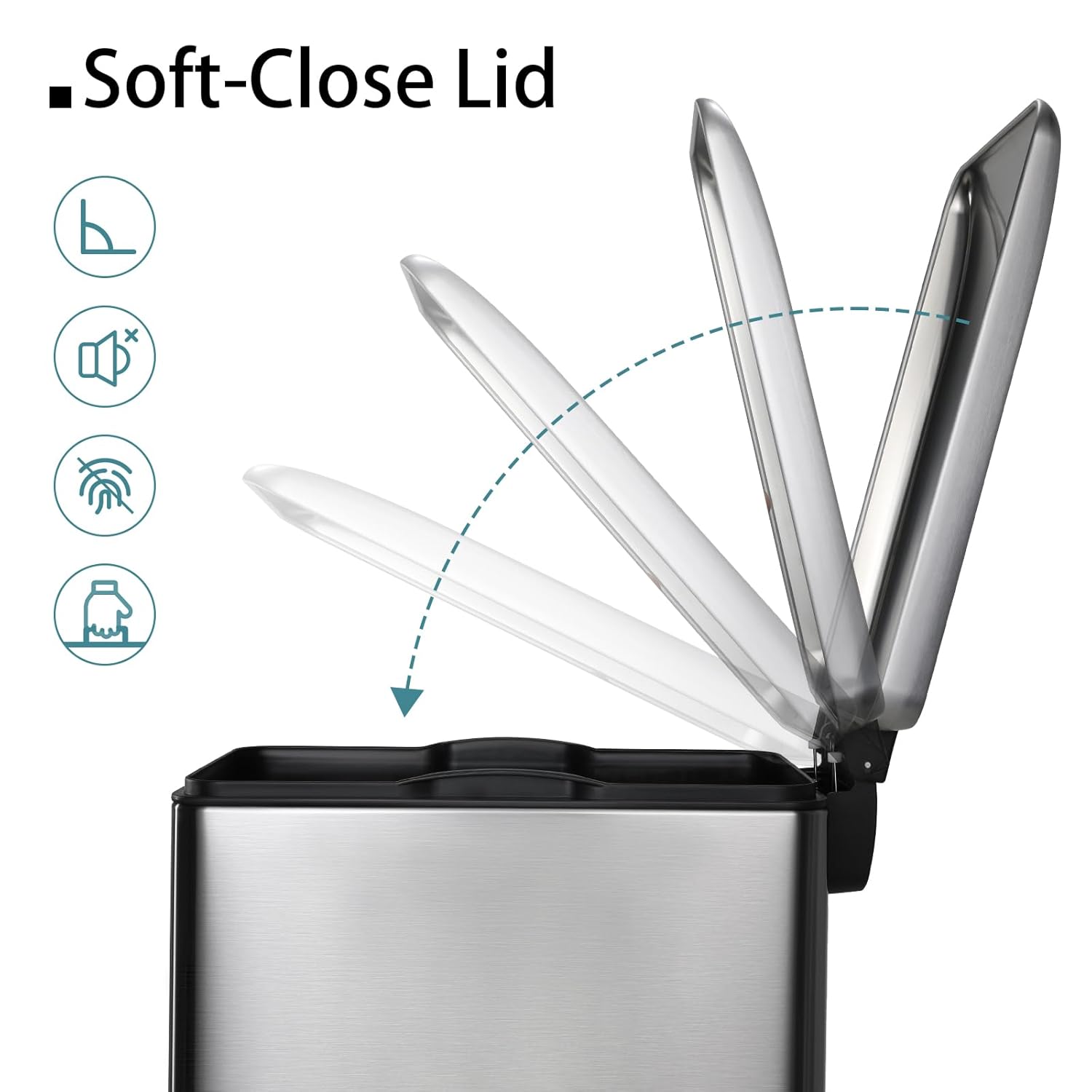 - 【Quiet-Close Lid】Garbage can lid is specially designed for a quiet, controlled open and close every time, so you can use the kitchen garbage can with confidence without worrying about disturbing your family. And it would also be a good choice to put the garbage cans in the corner of the bedroom.
