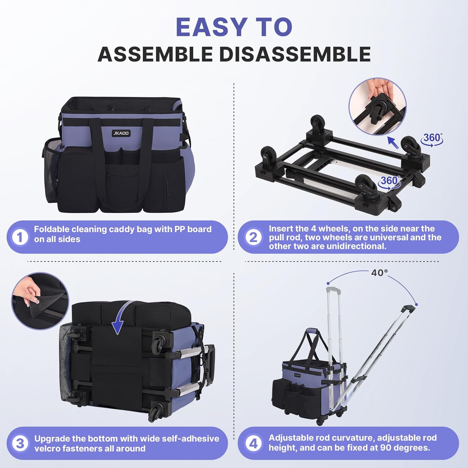 - 【Collapsible Support Panel, Quick Storage】The JKAOO rolling cleaning caddy bag has foldable PP boards on both sides, and support boards on all sides, and the shape is spacious and sturdy. It features 4 large Velcro buckles on bottom to secure the bag to the pole platform and bag side's cross-bar fixed design to prevent collapsing or tilting when filled with cleaning tools. The 4-level telescopic double rod handle can be adjusted to a maximum of 38.2 inches / 97 cm to meet push-pull requirements