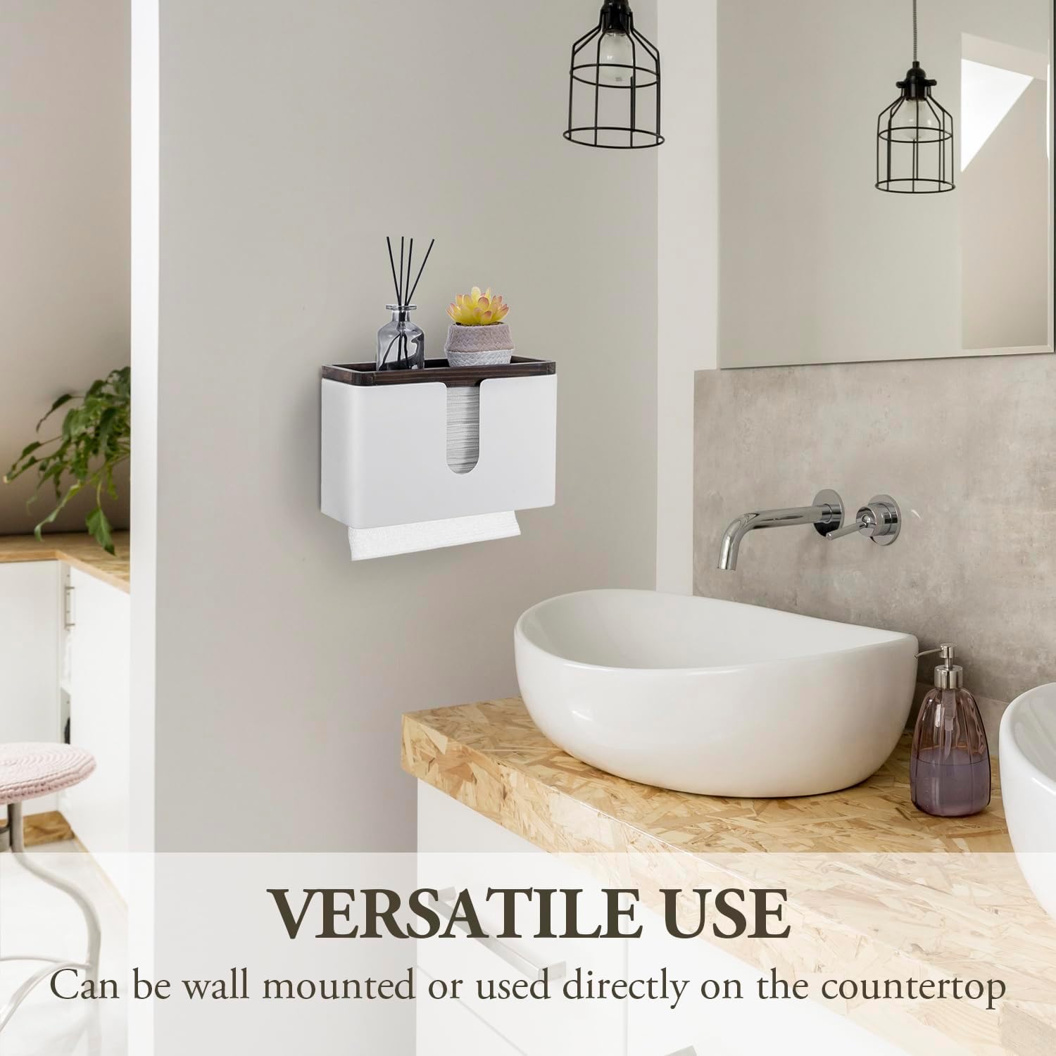 MyGift Deluxe Modern Matte White Metal Folded Commercial Paper Towel Holder with Rustic Burnt Solid Wood Tray Lid, Wall Mounted Trifold Multifold Z Fold Disposable Napkin Dispenser