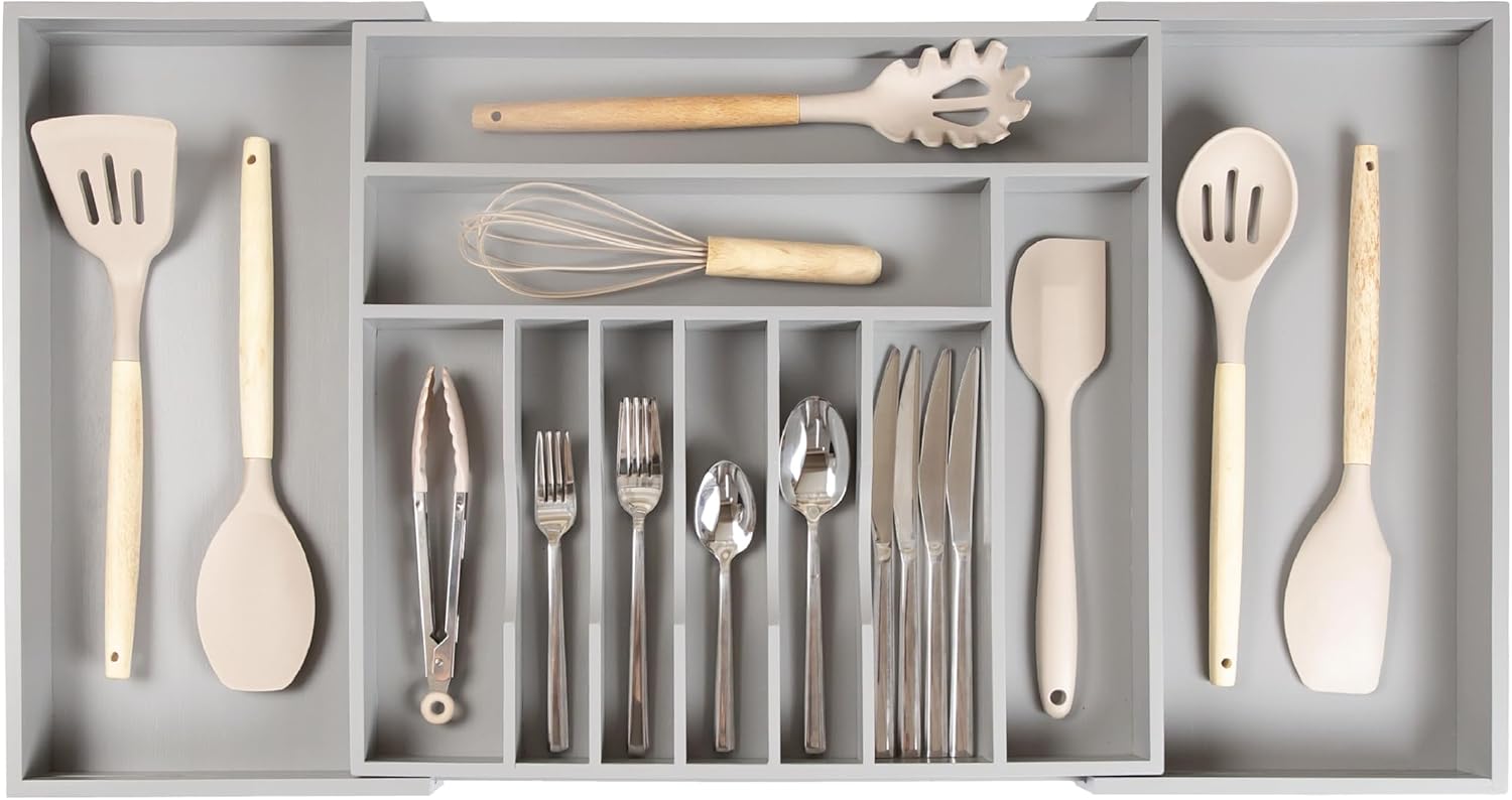 - MAXIMIZE YOUR DRAWERโS STORAGE CAPACITY: This 11-compartment (9 fixed + 2 adjustable) gray organizer measures 17.25โ long x 2.7โ tall and expands from 18โ to 33โ wide (and any width in between). Most other flatware organizers expand to 22โ or 23โ wide and are only 2โ tall. Itโs amazing how much storage capacity an extra 0.7โ in height adds when filling your organizer full of flatware and utensils!