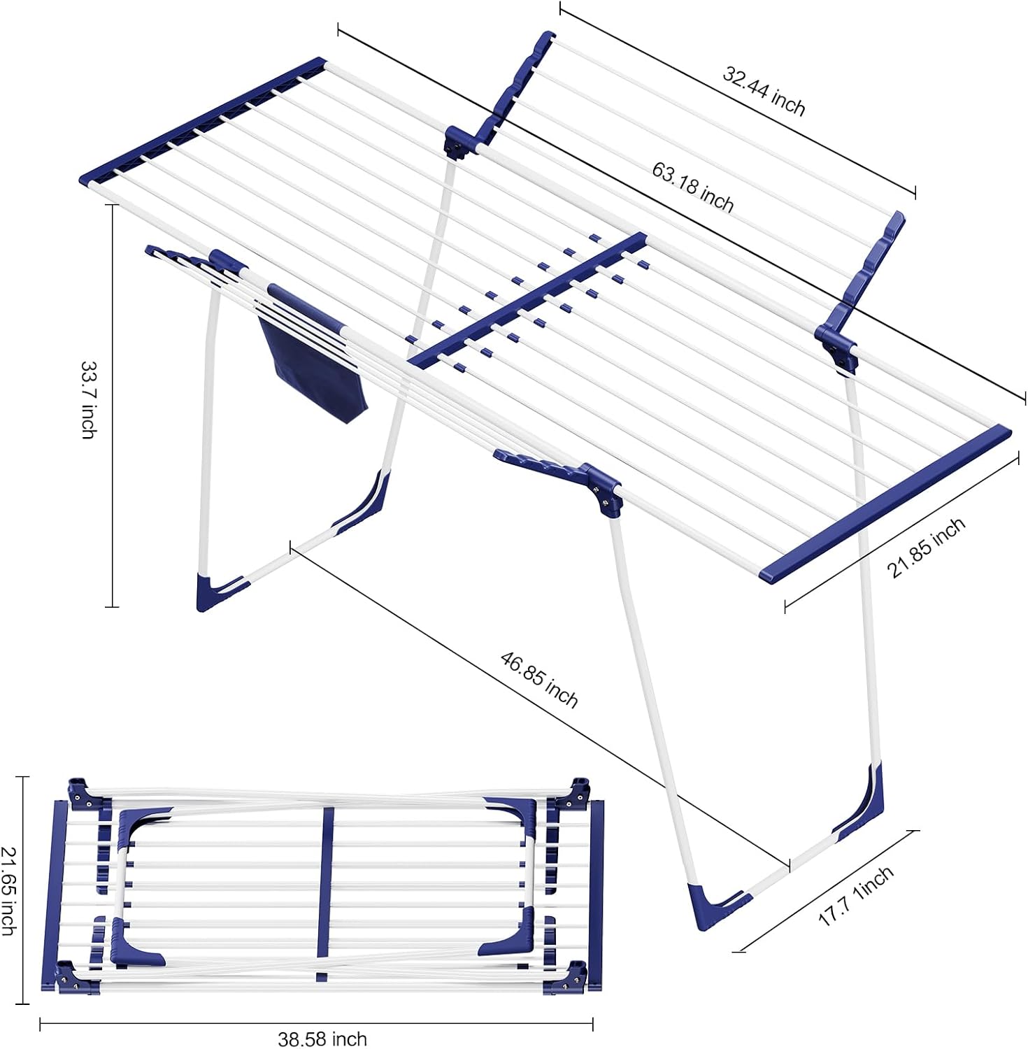 - Maximize Drying Space: The APEXCHASER clothes drying rack offers a generous drying space, measuring 63.2x21.85x33.7 inches, with 24 hanging rods, 10 clips, and 1 clip bag. The 2.4 inch spacing between rods gives efficient drying and accommodates all kinds of clothes easily.