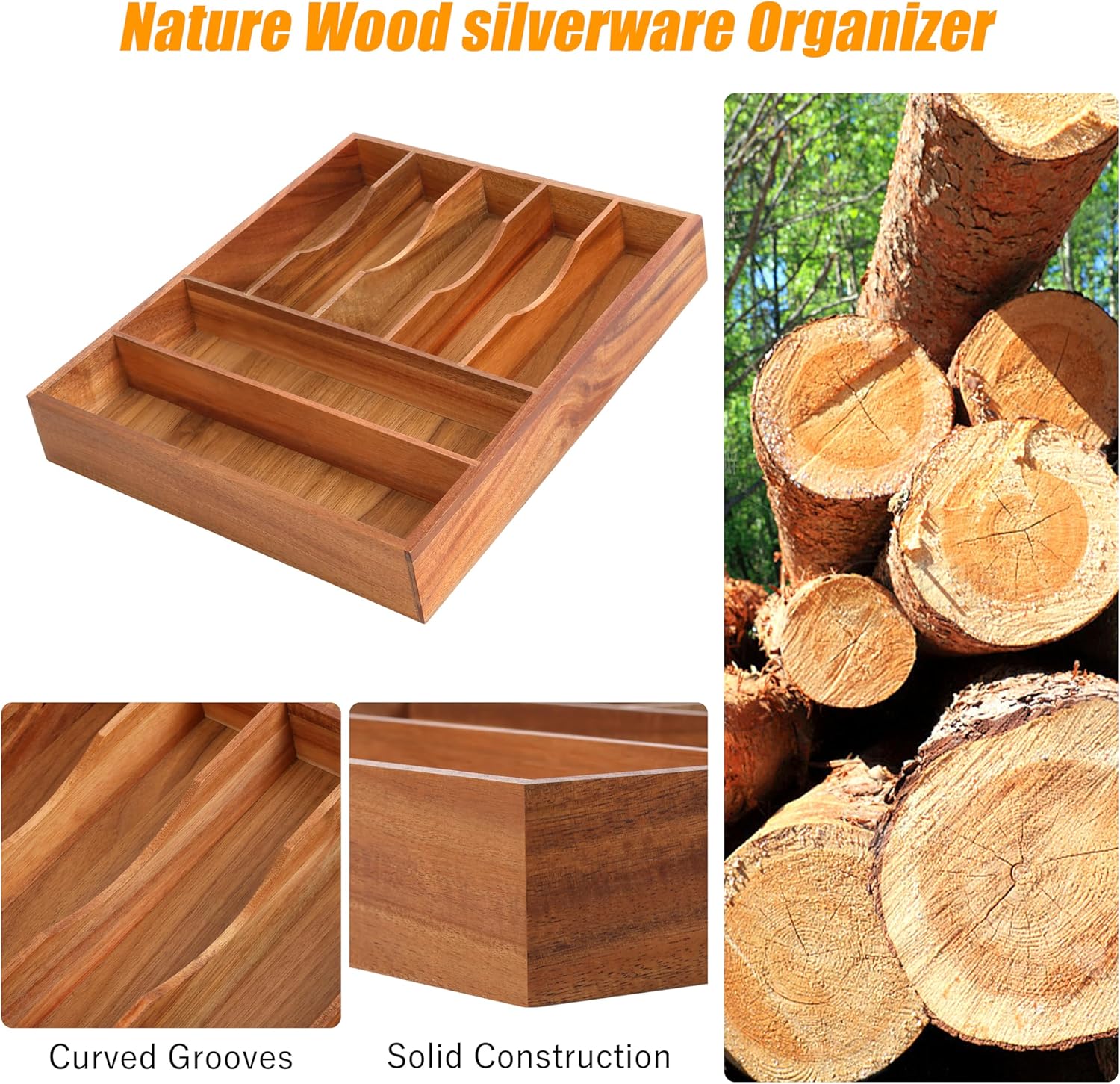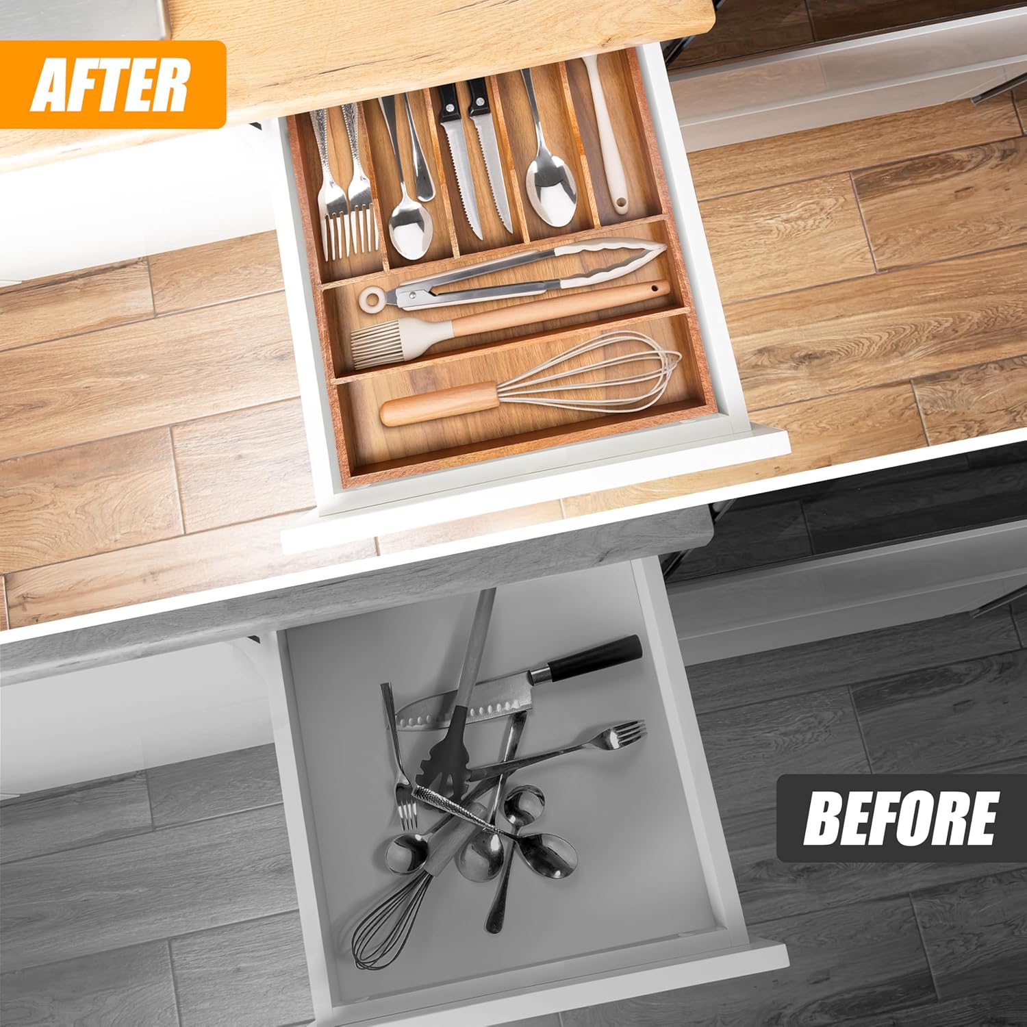 - ✅【Good Helper for Home Organization】Our utensil silverware drawer organizer flatware cutlery tray is designed to tackle the common issue of cluttered utensils and expanding junk drawers in the kitchen. Using our utensil silverware drawer organizer can help you keep your kitchen neatly organized. Measuring 15.7"x12.0", our utensil silverware drawer organizer features 7 spacious compartments, each with a 1.9" deep slot, making it convenient to organize and store kitchen utensils, rearrange them, and maintain an overall tidy and clean appearance.
