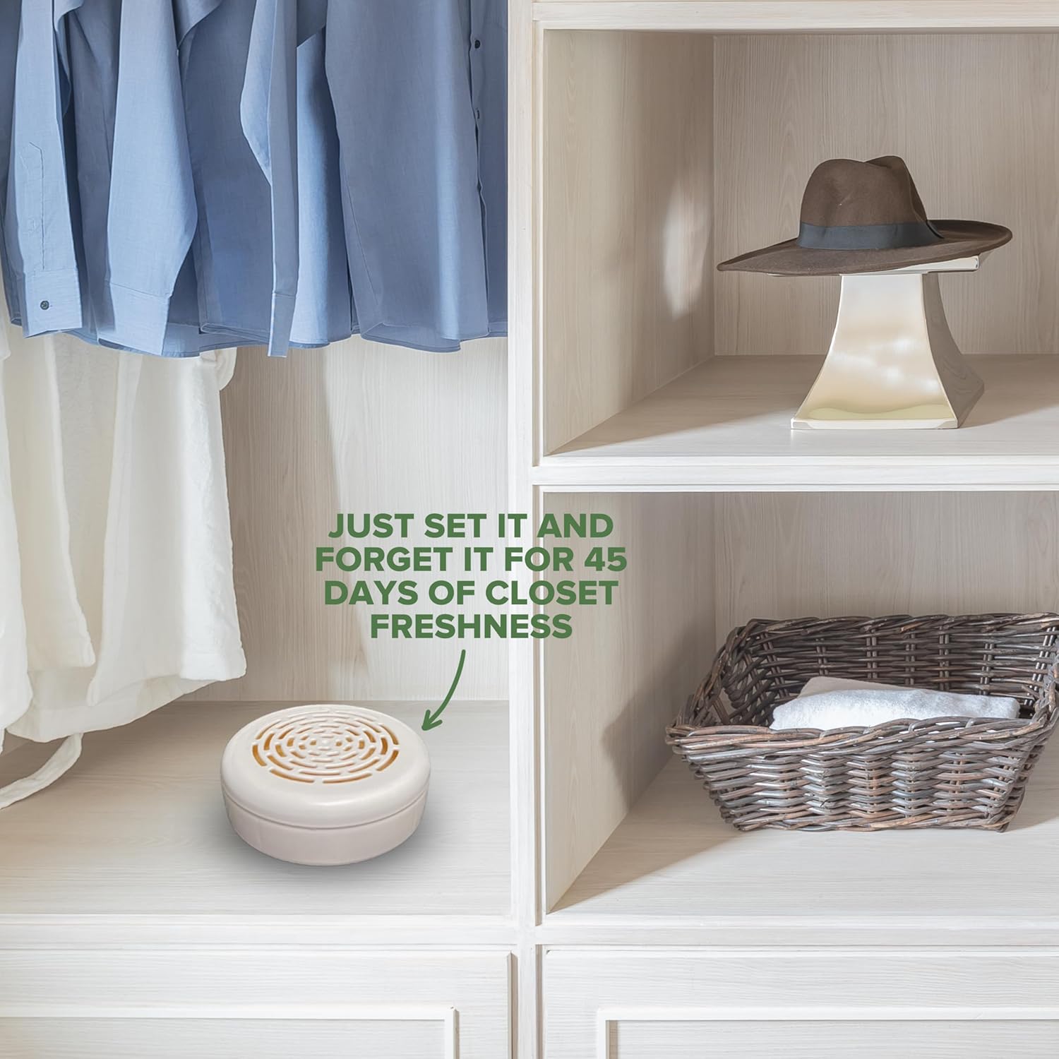 - ALWAYS-ON: Works around the clock, 24/7 to deodorize odor prone spaces and keep them smelling fresh like closets, laundry rooms, dresser drawers, bathrooms, gym bags, linen closets, laundry baskets, pet areas, and more!