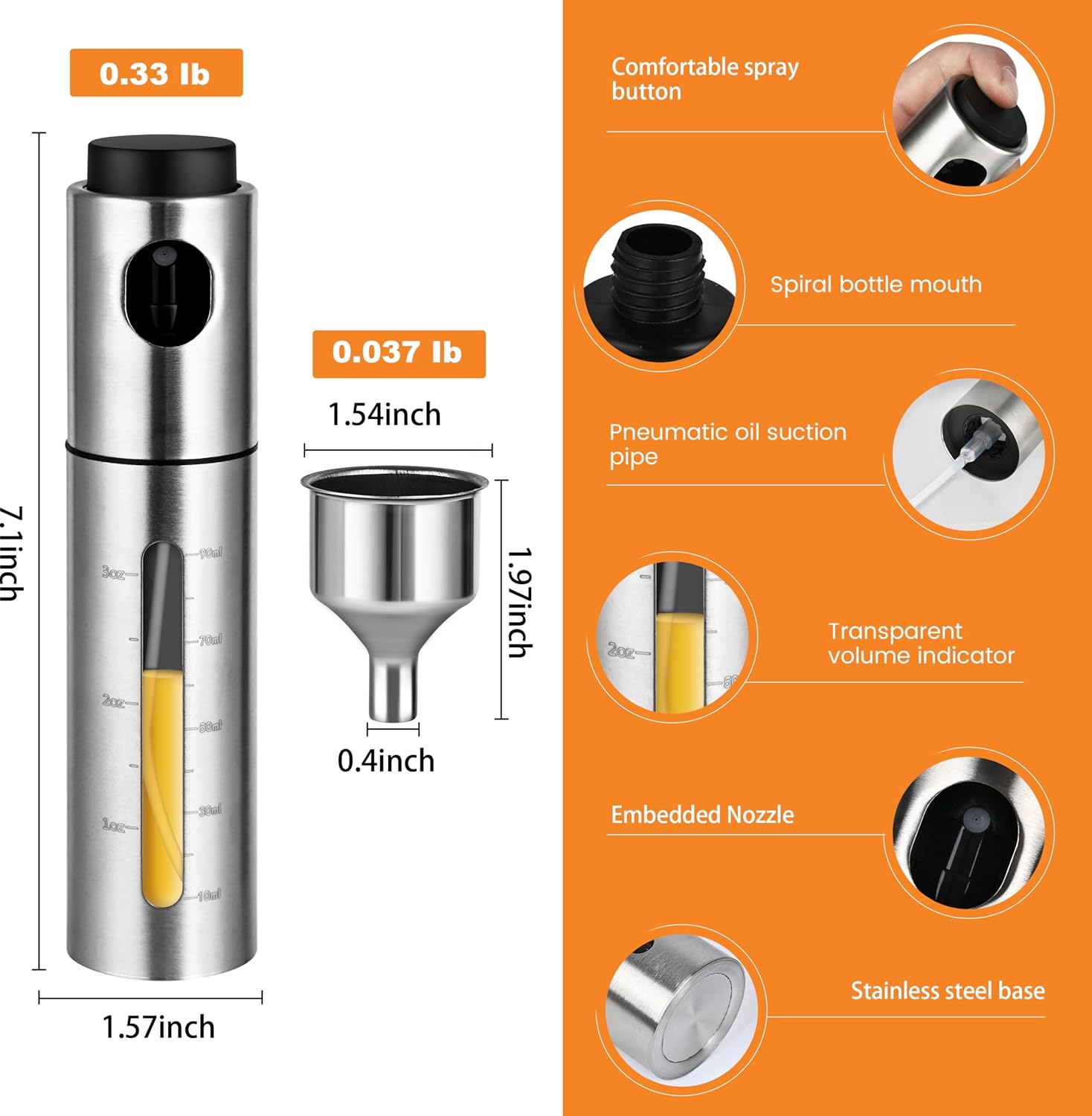 - Package Includes: 1 olive oil spray bottle, 1 stainless steel funnel. For better atomization, don’t fill to the top—leave some space for air pressure.