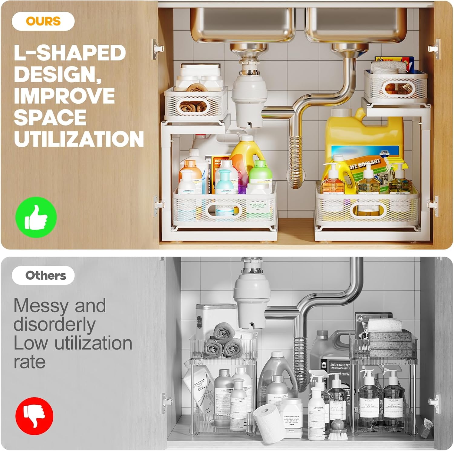 - ăTransform Your Space with Dual Pull-Out Designă Discover the efficiency of our 2-Pack Under Sink Storage Organizer! Featuring an innovative dual pull-out design, both tiers glide open for quick and easy access to your essentials. Whether youâre organizing cleaning supplies or personal care items, the 2-Tier Slide Out Drawer helps maintain a neat and tidy home, making your daily routine more manageable.