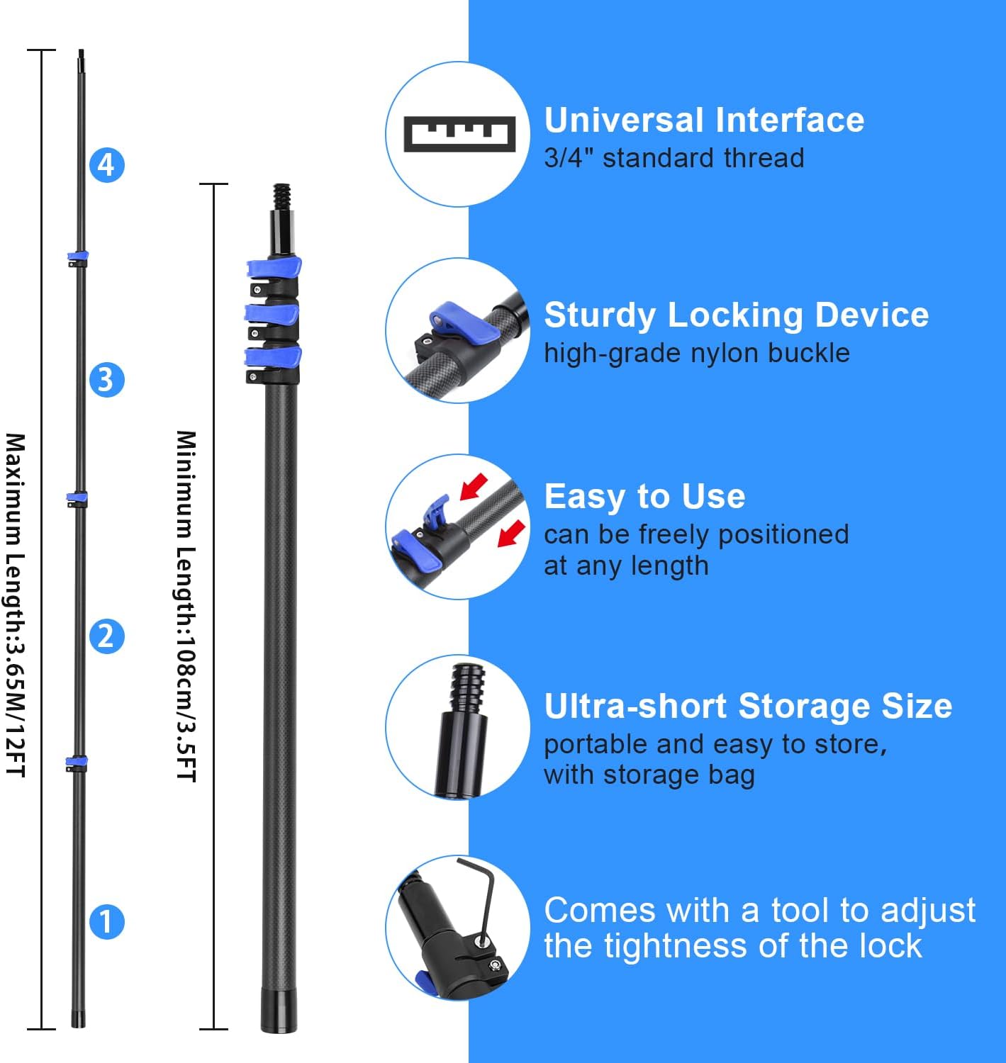 - 【Carbon Fiber Material】Compared with aluminum, carbon fiber has higher strength and rigidity. Our extension rod is made of carbon fiber material, which improves the bending and breaking phenomenon of traditional poles during use. The rust-proof and high-temperature resistant properties of carbon fiber make the pole more reliable and long-lasting.