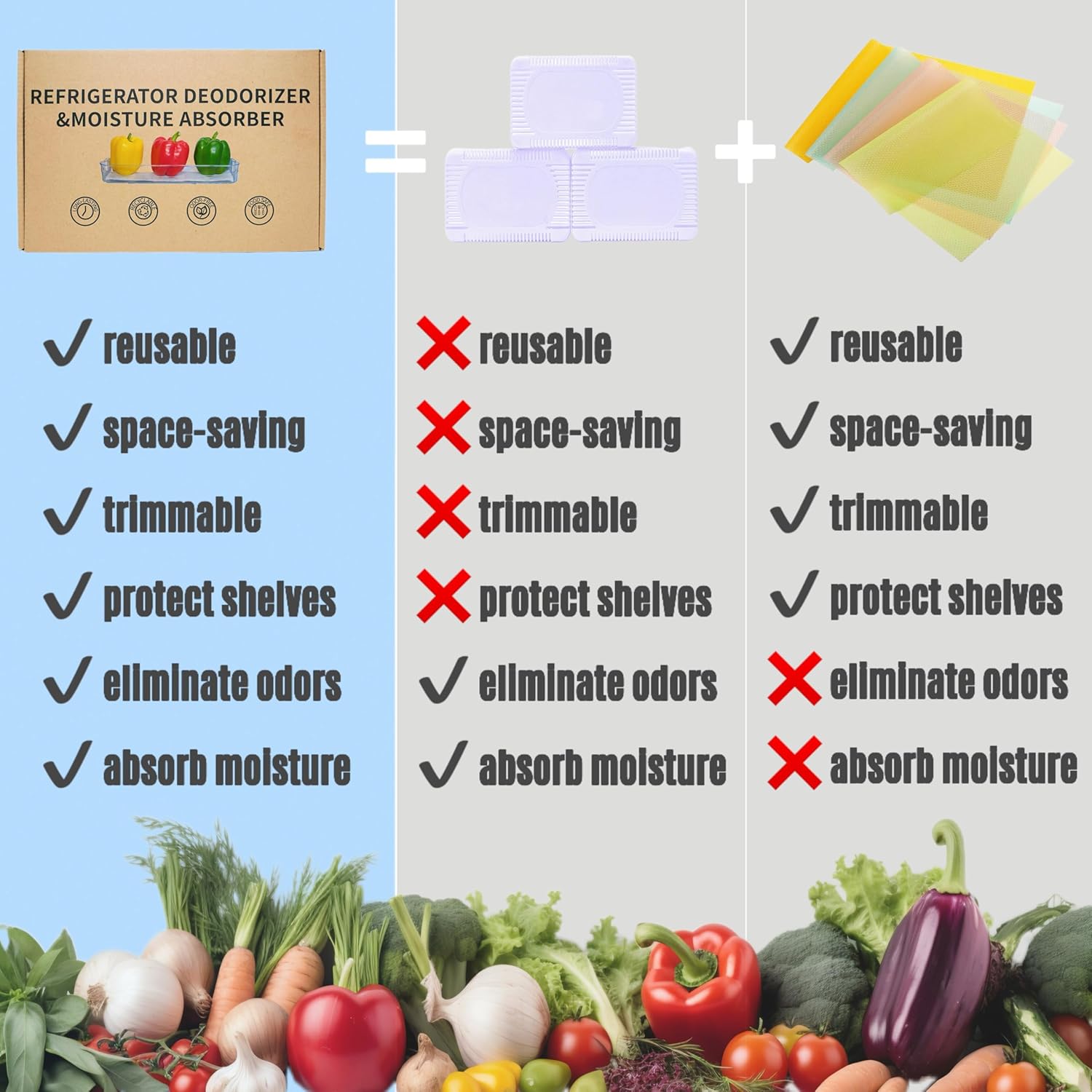 - Most Effective Odor Elimination Technology: Precision-engineered compartmentalized squares ("deodorizing chambers") densely packed with activated charcoal particles and super-absorbent silica gel β targets odors at molecular level while balancing fridge humidity to 40-60% ideal range.