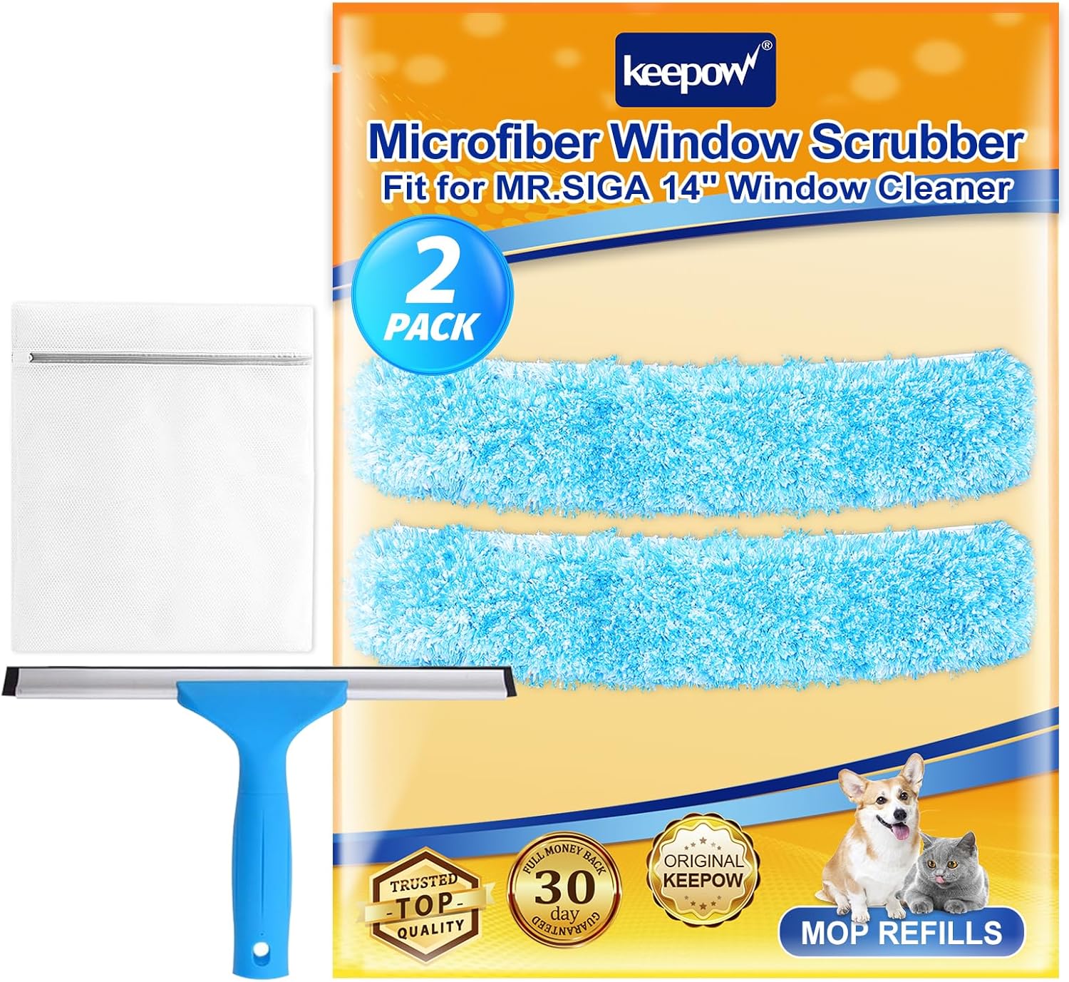 KEEPOW 14" Microfiber Window Scrubber Refill Replacement Compatible with MR.SIGA, Compatible with Ettore Professional Window Cleaning, Reusable & Washable Window Squeegee for Home (2 Pack)