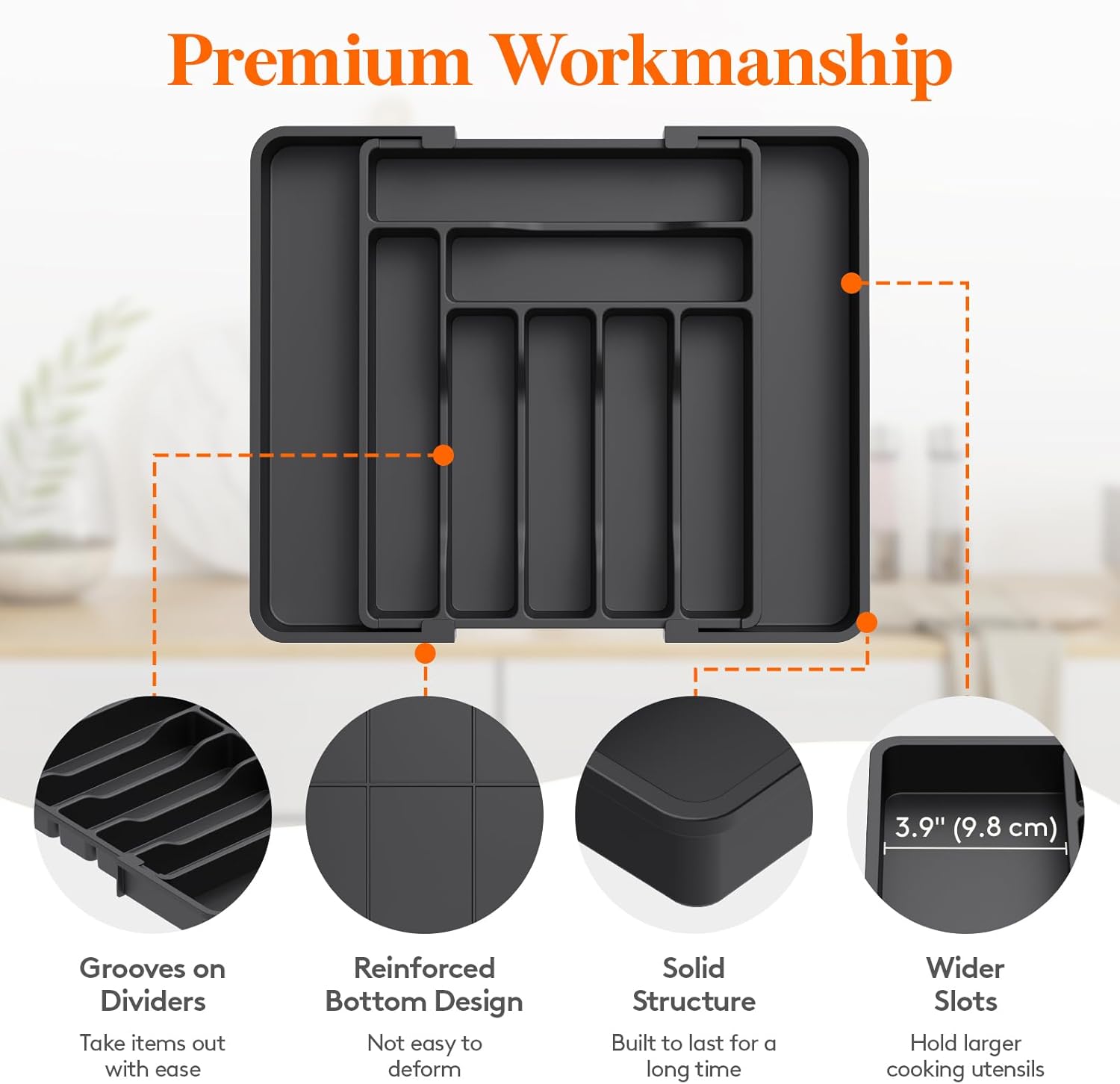 - Robust and Safe: This kitchen drawer organizer is crafted from premium PP material, BPA-free and built to last. It ensures your silverware is stored in a healthy, safe environment for worry-free use