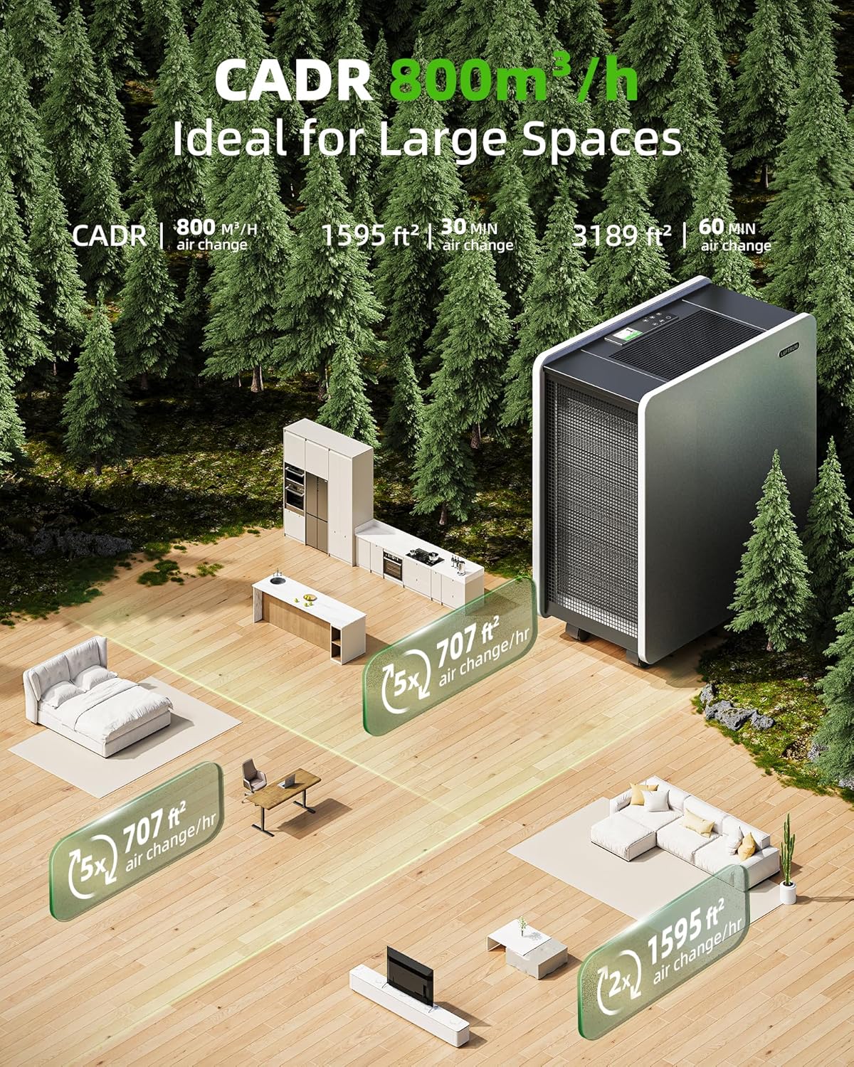 - CADR 930m³/h Ideal for Large Spaces:Turn on this efficient air purifier, and in just 30 minutes, it can rejuvenate a space of 2062 sq ft, and purify an area up to 4125 sq ft within 1 hour. Its snail shell design gives it powerful wind force, with a CADR 930m³/h. Whether for home or office use, it can quickly provide pure air, making your living environment safer and more comfortable.
