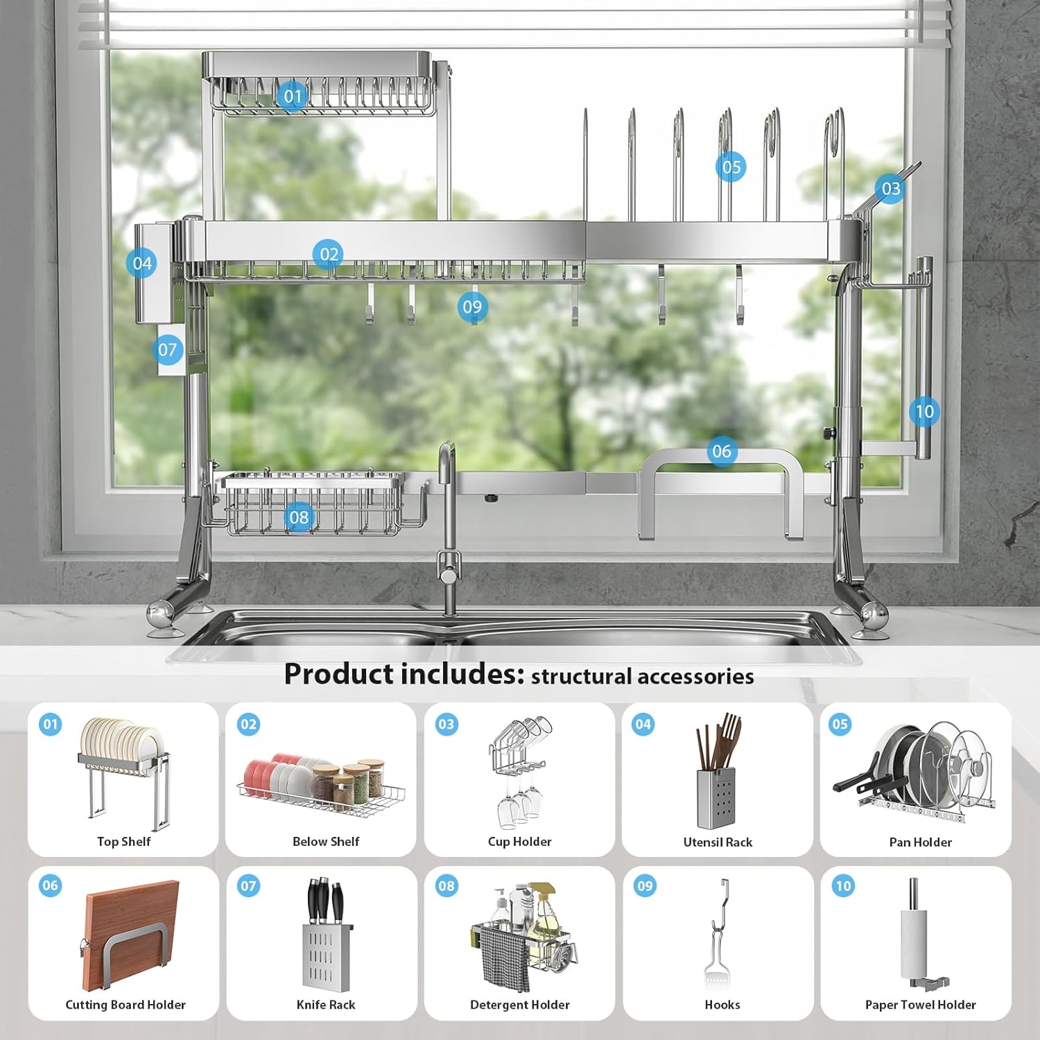 - 【Multifunctional Kitchen Organizer】This over sink dish rack features a multifunctional design that contains dish drying rack, pots and pans rack can meet your most needs for kitchen storage. Besides, added pot lid holders for more convenience. All the accessories are complete, including knife holder, storage basket, cutlery holder, cutting board rack, cup hanging, hook up, paper holder. (All accessories are made of stainless steel).