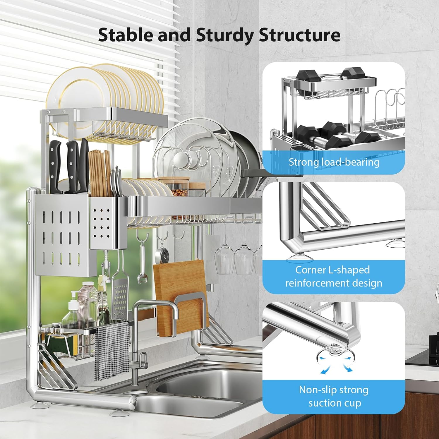 Over Sink Dish Drying Rack, Upgrade 2.5-Tier 304 Stainless Steel Dish Rack Adjustable Length with Pots and Pans Rack, Modern Over The Sink Dish Drainer Rack for Kitchen Storage Counter Organizer