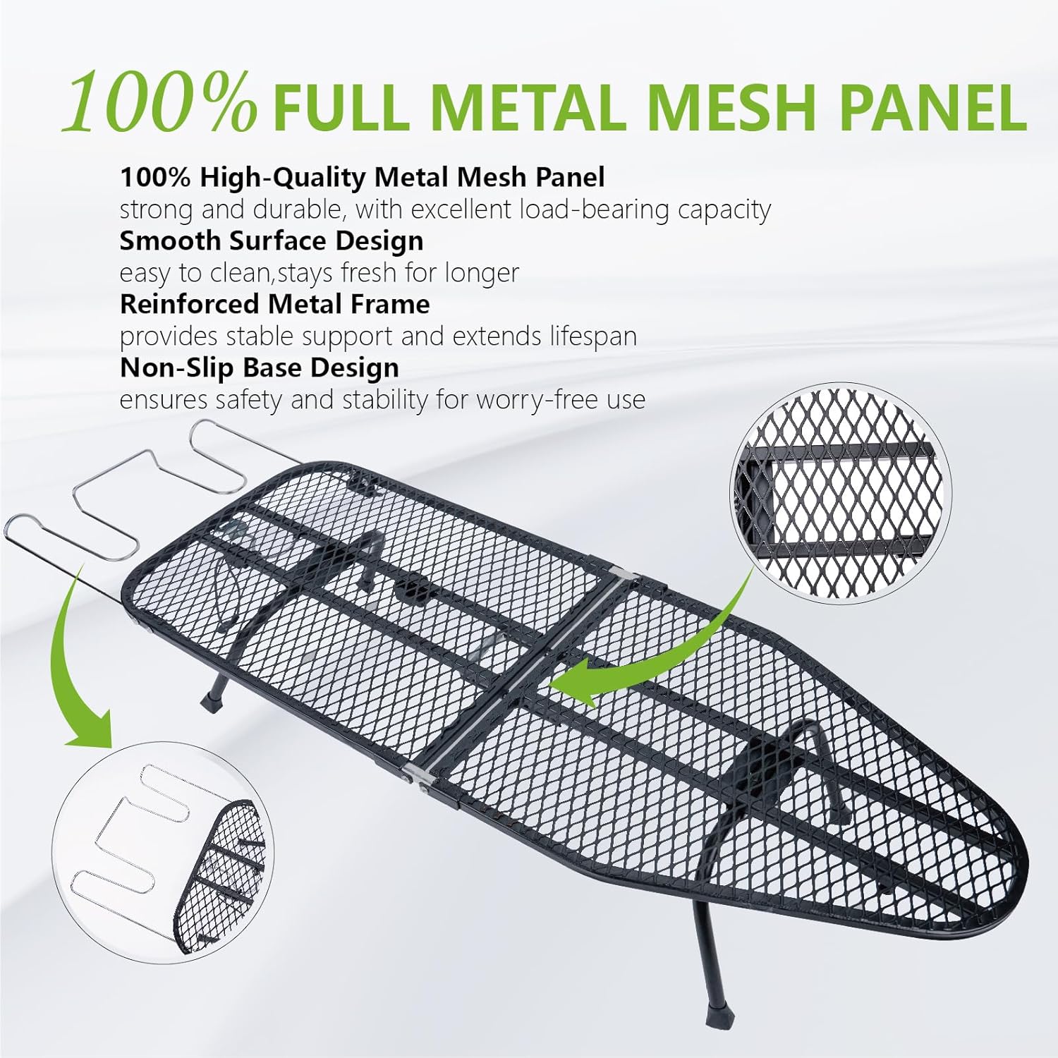 - Highly efficient ironing: the metal mesh panel helps to dissipate heat more quickly; Equipped with a heat-resistant cover and 100% cotton pads for good ventilation to prevent damage to the tabletop ironing board and clothes