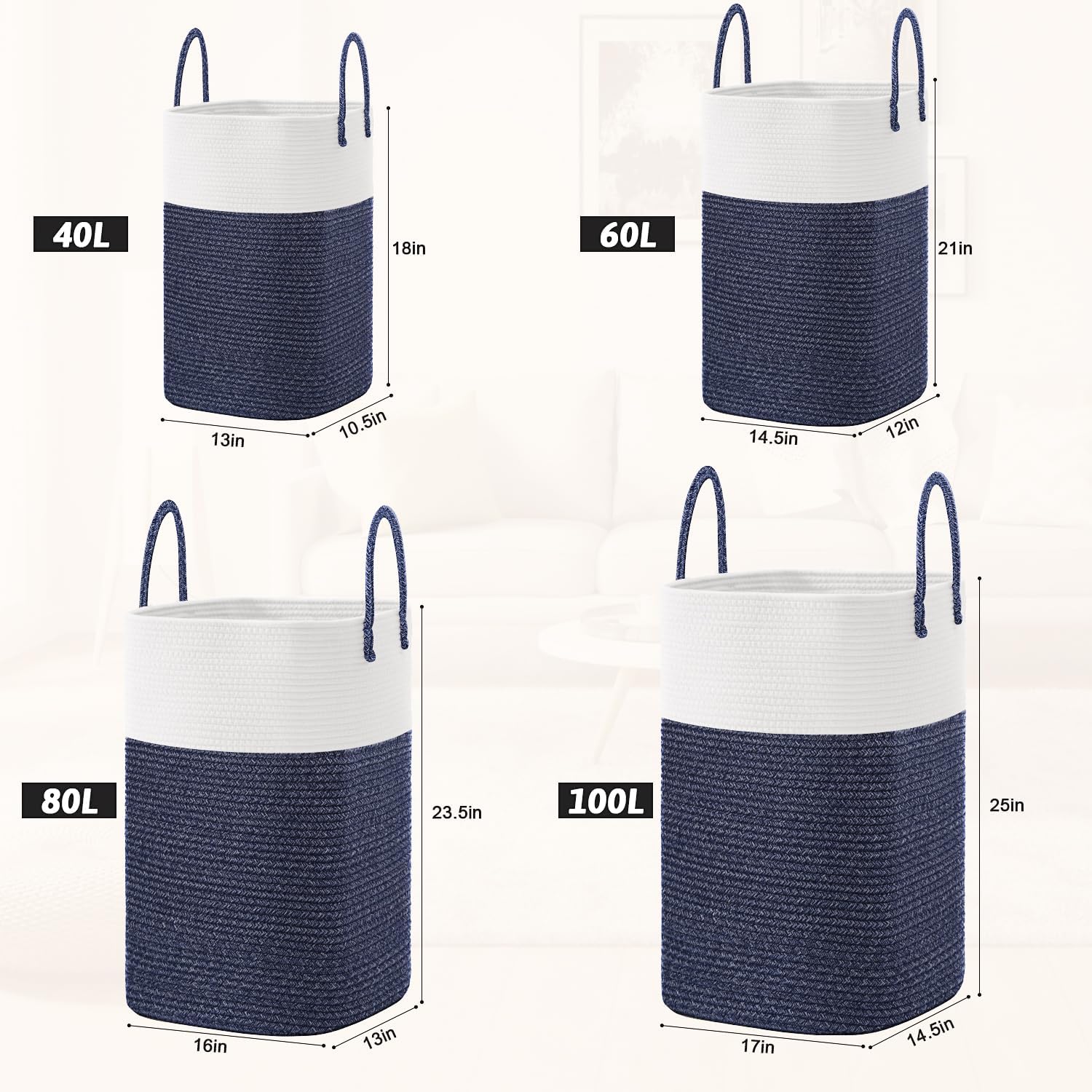 Laundry Basket,Woven Cotton Rope Laundry Hamper,Versatile Storage for Dirty Clothes,Baby Toys,and Blankets in Bathroom, Nursery,and Living Room (Blue, 100L)