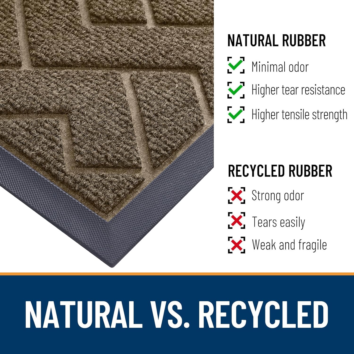 - [STURDY NATURAL RUBBER BACKING] The OLANLY heavy-duty door mat features an ultra-thin design, allowing it to effortlessly glide under most doors without jamming or curling. Crafted with a sturdy natural rubber backing, our product offers higher tensile strength, increased tear resistance, and less odor compared to synthetic rubber.