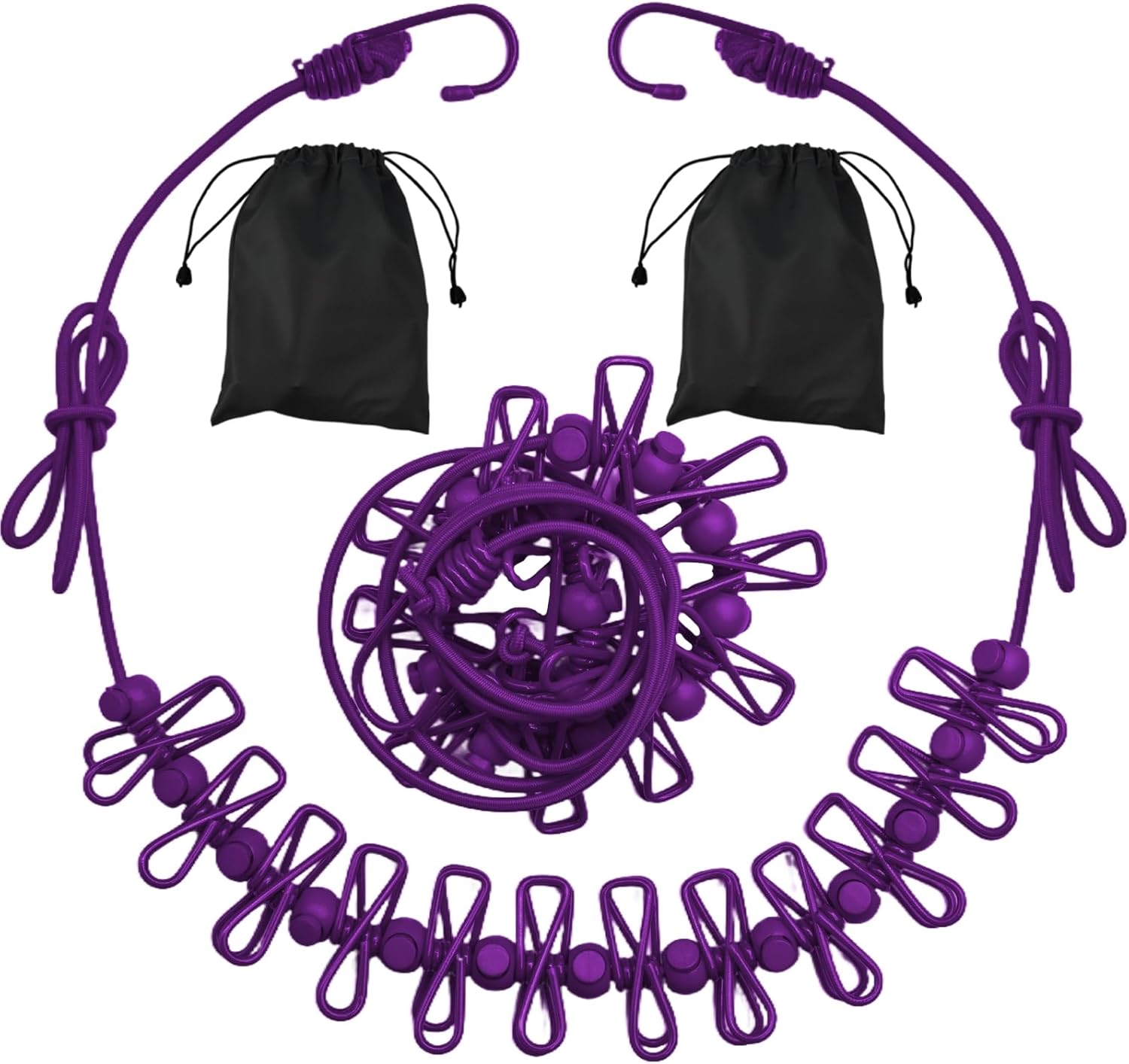 2 Pack Camping Clothesline Portable 12 Clothespins, Purple Camping Accessories Travel Clothesline for Outdoor Indoor, Retractable Clothes Line Elastic Clothesline for Camper Hotel Room