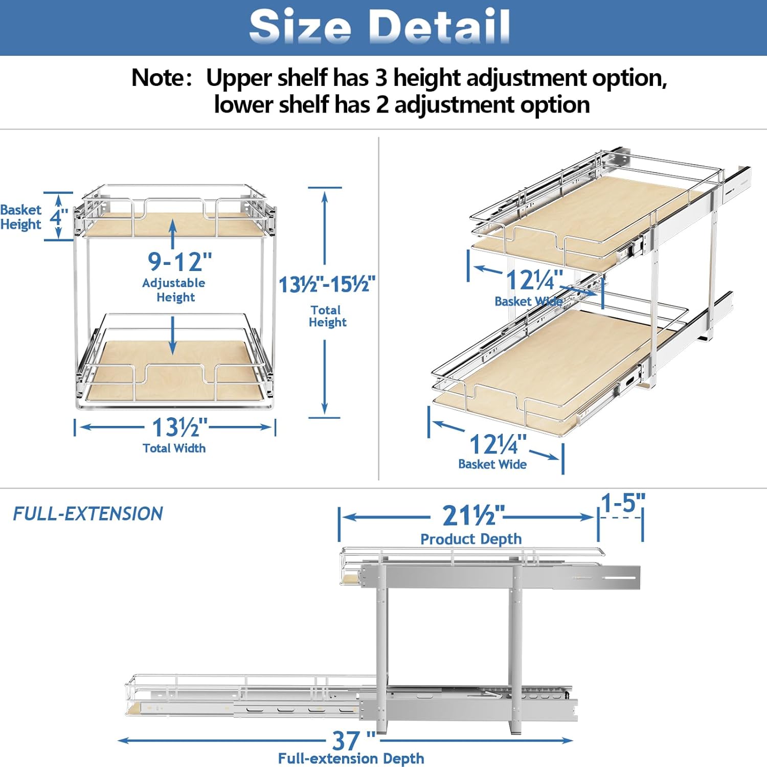 - 【Upgraded Wooden Shelf Design】The unique high-end birch solid wood board aesthetic design, polished metal, and bright anti rust chrome coating make the interior and exterior of the cabinet equally beautiful. The upper and lower baskets have a height adjustment, with two adjustable heights on the lower shelf and three adjustable heights on the upper shelf. You can adjust the height according to your own items and cabinets.
