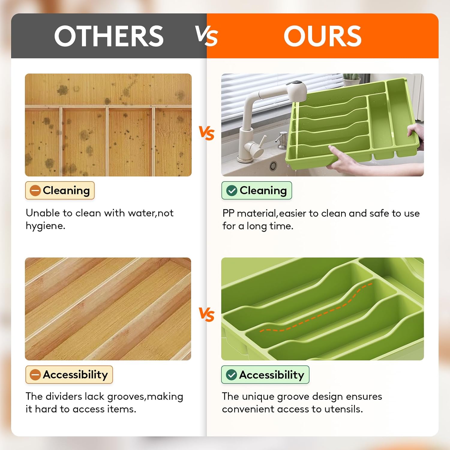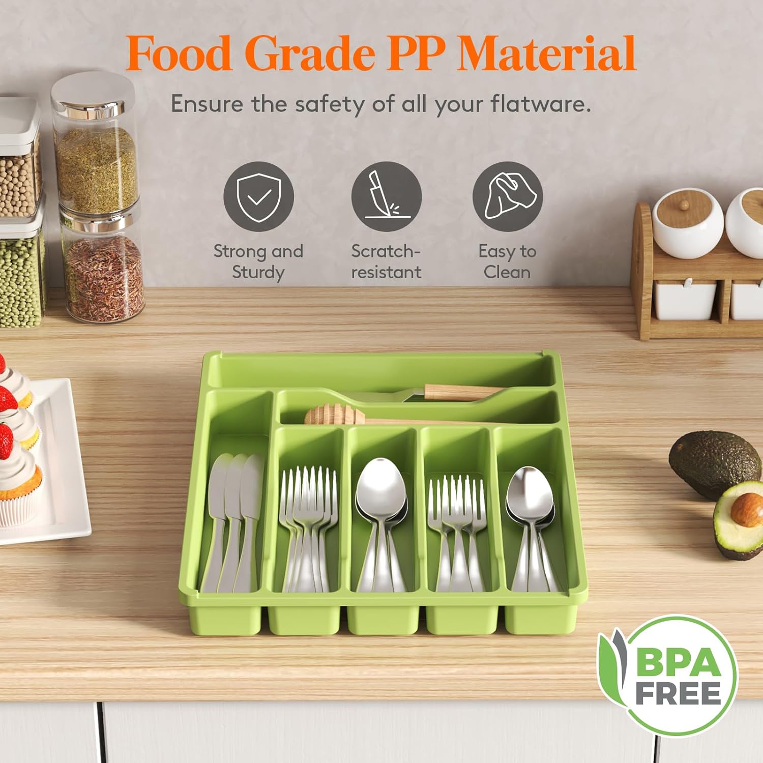 - Robust and Safe: This kitchen drawer organizer is crafted from premium PP material, BPA-free and built to last. It ensures your silverware is stored in a healthy, safe environment for worry-free use