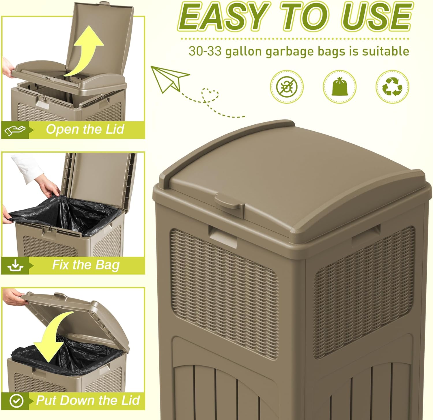 - Multi-Functional Use: This resin outdoor trash can withstand the effects of various outdoor elements, preventing the entry of water and dust. It can also be used as an outdoor storage bin, suitable for patio, swimming pool and other multi-scenario use needs.