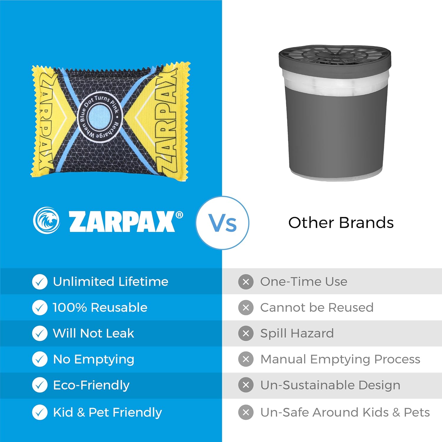 - IMPEDE DAMPNESS: Protect your home effectively with ZARPAX's house and car dehumidifier bags. If undeterred, dampness will happily advance into many places into your home and car, including as laundry rooms, garages, gun safes, closets & pantries. Our moisture absorbers attract & lock in unwanted moisture. Our moisture absorber dehumidifier bags eradicate surplus moisture, musky scents & excess humidity for a fresh, welcoming home.