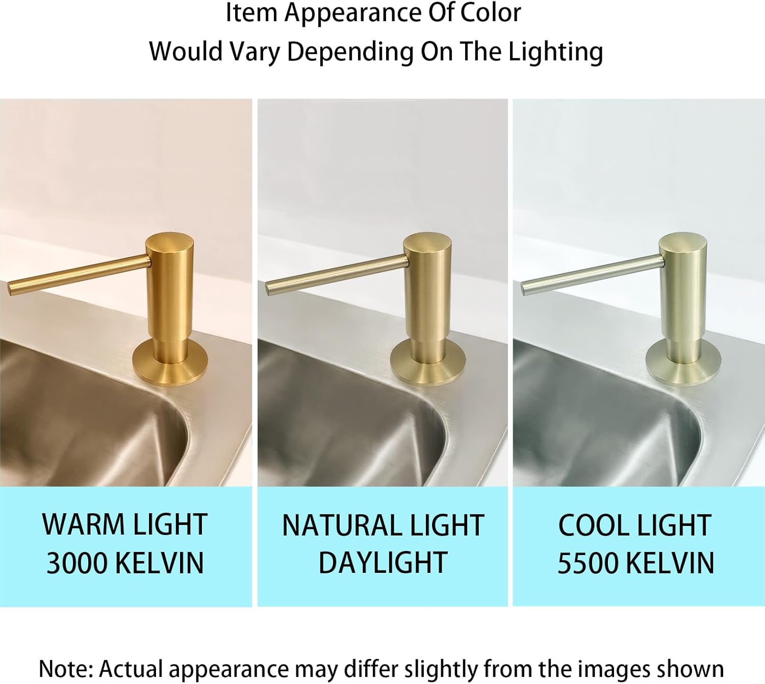 - Built To Last:Sturdy built in sink soap dispenser for kitchen sink, solid brass pump head and threaded tube with 17 OZ PET plastic bottle, corrosion resistant spring. SOLID BRASS CONSTRUCTION brushed gold rust resistant finish that will not tarnish as time goes on. The soap dispenser pump mechanism is designed for long lasting excellent performance to dispense consistently with each and every press. Coordinates with most faucet models from different brands.