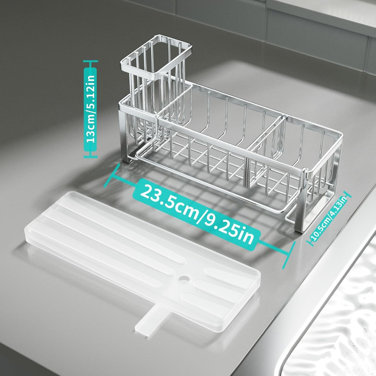 - [Reasonable Size & Support]: The size of our sink organizer is 9.25*4.13*5.12 inches. Our sponge caddy for kitchen sink can meet your daily needs well. If you are not satisfied with this sink caddy kitchen sink organizer, please reach out to us