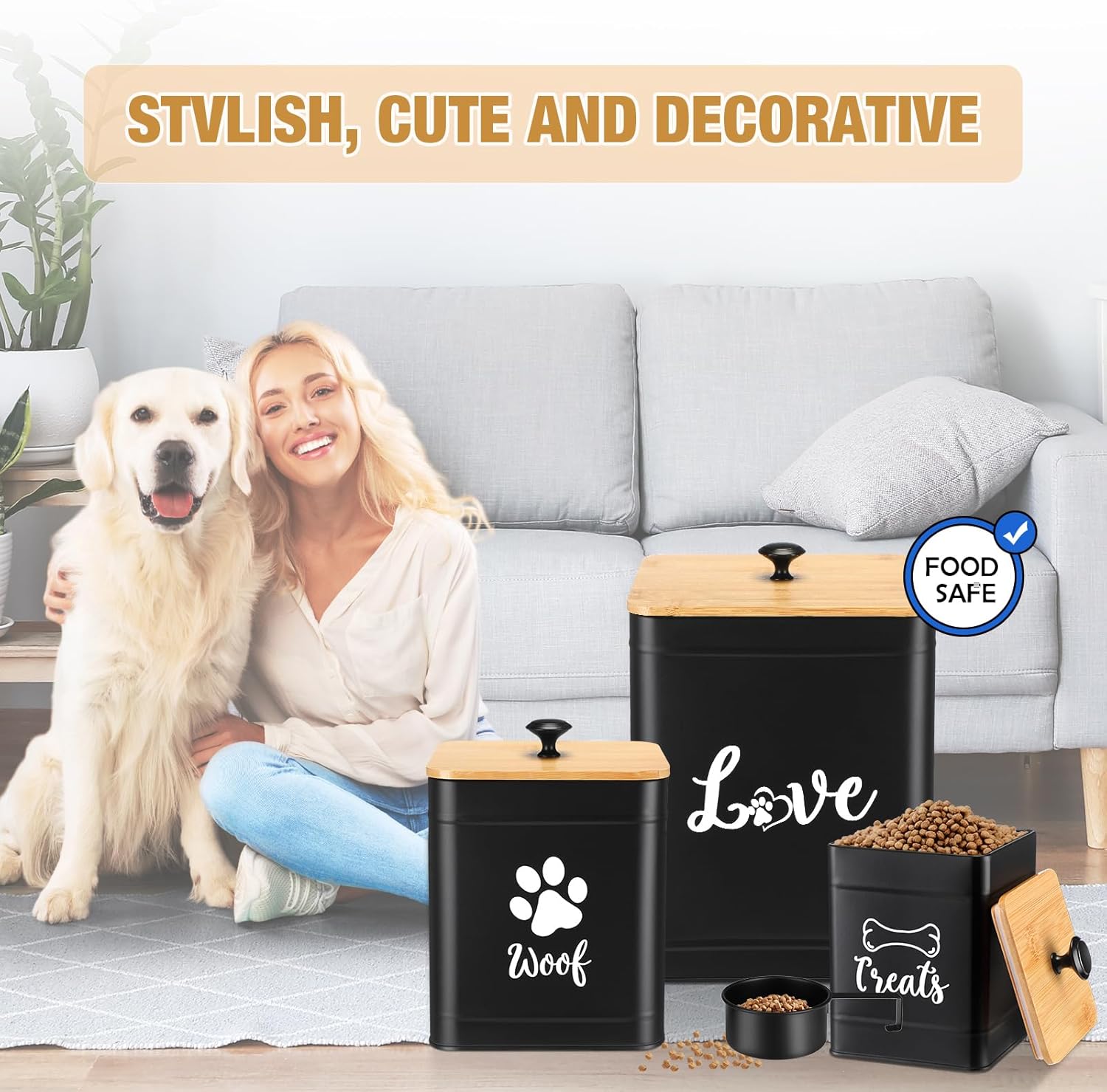 - Versatility: these cute design dog food tins are nice for your kitchen, office, pet station, console table or anywhere; The small size dog snacks jar in the set is easier to carry, you can take it out to play with your pet; Each container is suitable for dog cookie, bone, dry or wet food, snack, teething stick, or treat storage