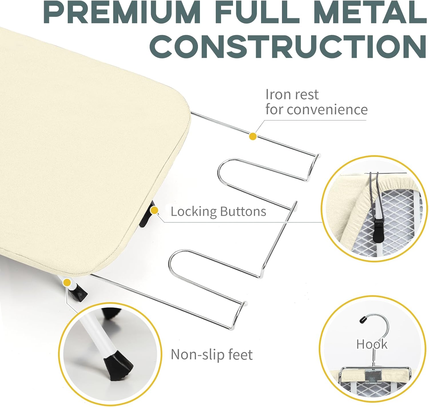- Sturdy and Stable: The well made metal frame is sturdy and durable with a non-slip silicone cap, and the solid structure ensures that the compact ironing board tabletop is stable enough