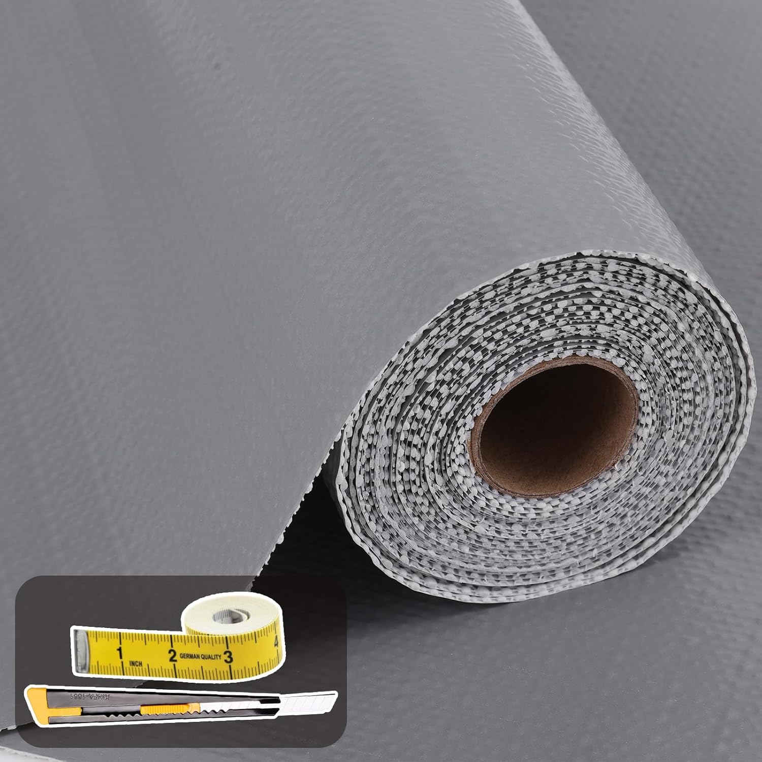 Shelf Liners for Kitchen Cabinets 12in x 20FT Non Adhesive Drawer Liner Grey Thickened Shelf Liner Paper Strong Non-Slip Easy to Clean for Tool Box Refrigerator with Knife and Tape Measure